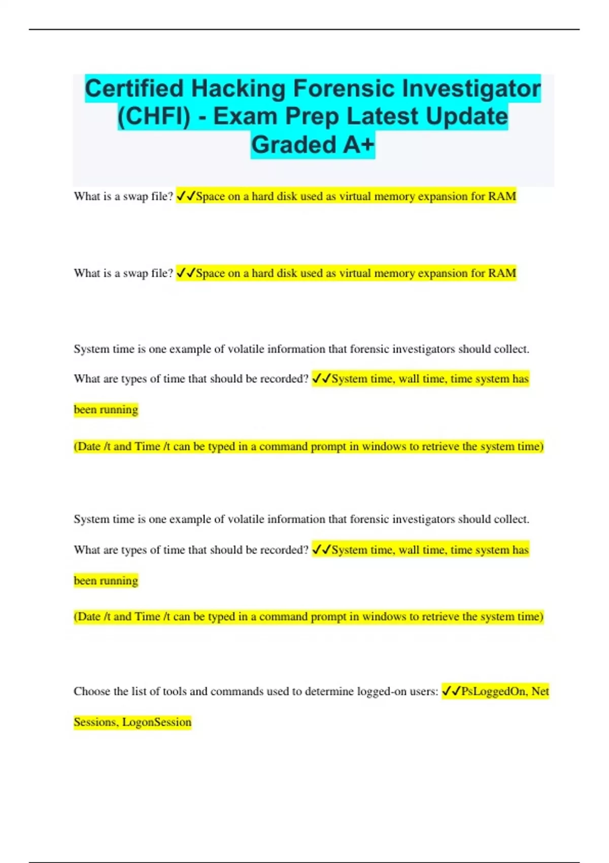 What is a swap file? Space on a hard disk used as virtual memory expansion for RAM What is a swap file? Space on a hard disk used as virtual memory expansion for RAM System time is one example of volatile information that forensic investigators should collect. What are types of time that should be recorded? System time, wall time, time system has been running (Date /t and Time /t can be typed in a command prompt in windows to retrieve the system time) System time is one example of volatile information that forensic investigators should collect. What are types of time that should be recorded? System time, wall time, time system has been running (Date /t and Time /t can be typed in a command prompt in windows to retrieve the system time) Choose the list of tools and commands used to determine logged-on users: PsLoggedOn, Net Sessions, LogonSessionChoose the list of tools and commands used to determine logged-on users: PsLoggedOn, Net Sessions, LogonSession What tools can be used to see which files are open? Net file, PsFile, Openfiles (Net file reveals names of all open shared files and the number of file locks, PsFile shows list of files open remotely, openfiles can be used to list or disconnect all open files and folders) What tools can be used to see which files are open? Net file, PsFile, Openfiles (Net file reveals names of all open shared files and the number of file locks, PsFile shows list of files open remotely, openfiles can be used to list or disconnect all open files and folders) True or False: When connections are made to other systems using NetBIOS communications, the system will maintain a list of other systems connected. By viewing the contents of the name table cache, an investigator might be able to find other systems affected. True (A cache is duplicate data stored in a temporary location so a computer can rapidly access that data. In this case, the NetBIOS Remote Cache Name Table may contain a list of systems that a computer has connected to. nbtstat -c can be used to view the cache of NetBIOS names on the host operating system)True or False: When connections are made to other systems using NetBIOS communications, the system will maintain a list of other systems connected. By viewing the contents of the name table cache, an investigator might be able to find other systems affected. True (A cache is duplicate data stored in a temporary location so a computer can rapidly access that data. In this case, the NetBIOS Remote Cache Name Table may contain a list of systems that a computer has connected to. nbtstat -c can be used to view the cache of NetBIOS names on the host operating system) It appears the suspect's computer is connected to a network, what is one thing an investigator should look for? Network connections (Information about network connections can expire over time so an investigator must collect evidence as soon as possible after an incident.) It appears the suspect's computer is connected to a network, what is one thing an investigator should look for? Network connections (Information about network connections can expire over time so an investigator must collect evidence as soon as possible after an incident.) What are two commands to obtain network information? netstat -ano & netstat -r(* netstat -ano shows active connections including protocol, local address, foreign address, state and PID * netstat -r shows the routing table * netstat -b displays the executable involved in creating the connection * netstat -v is used in conjunction with -b to show sequence of components involved) What are two commands to obtain network information? netstat -ano & netstat -r (* netstat -ano shows active connections including protocol, local address, foreign address, state and PID *