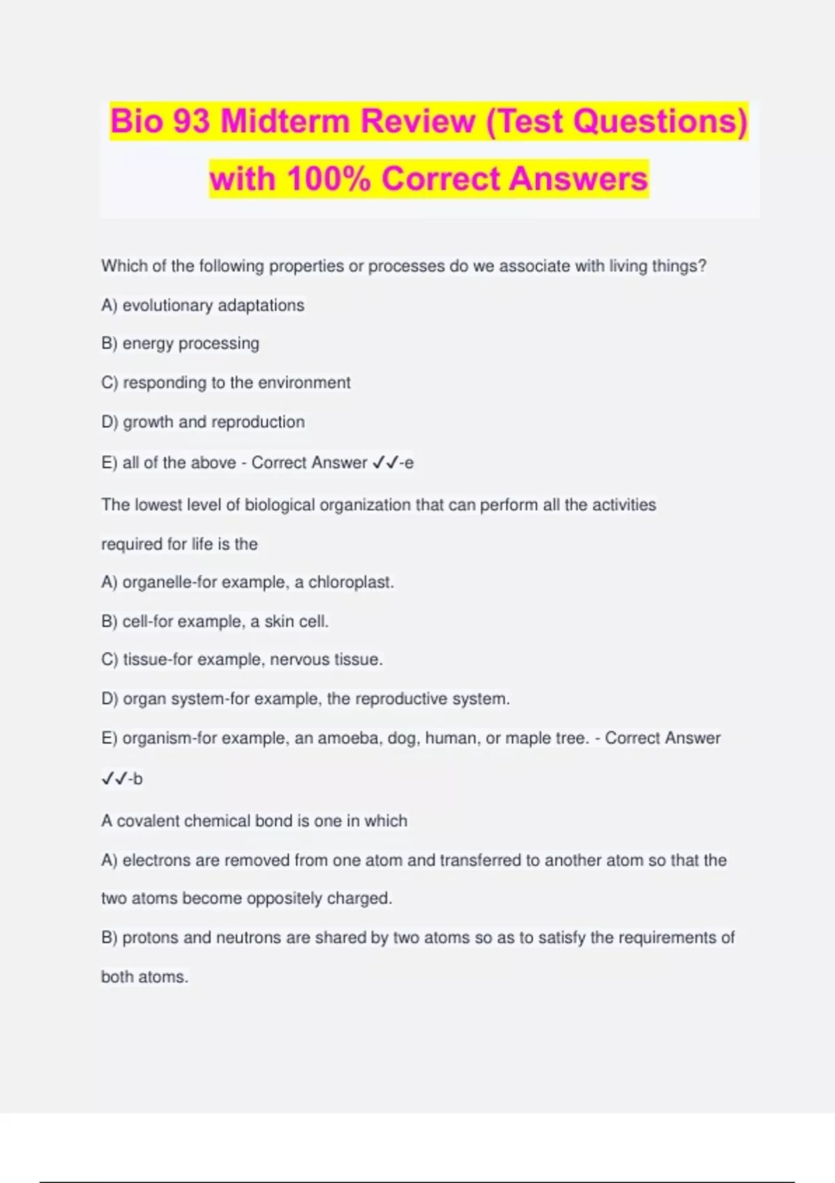 Bio 93 Midterm Review (Test Questions) with 100% Correct Answers Which of the following properties or processes do we associate with living things? A) evolutionary adaptations B) energy processing C) responding to the environment D) growth and reproduction E) all of the above - Correct Answer ️️ -e The lowest level of biological organization that can perform all the activities required for life is the A) organelle-for example, a chloroplast. B) cell-for example, a skin cell. C) tissue-for example, nervous tissue. D) organ system-for example, the reproductive system. E) organism-for example, an amoeba, dog, human, or maple tree. - Correct Answer ️️ -b A covalent chemical bond is one in which A) electrons are removed from one atom and transferred to another atom so that the two atoms become oppositely charged. B) protons and neutrons are shared by two atoms so as to satisfy the requirements of both atoms. C) outer-shell electrons of two atoms are shared so as to satisfactorily fill the outer electron shells of both atoms. D) outer-shell electrons of one atom are transferred to the inner electron shells of another atom. E) the inner-shell electrons of one atom are transferred to the outer shell of another atom. - Correct Answer ️️ -c The ionic bond of sodium chloride is formed when A) chlorine gains an electron from sodium. B) sodium and chlorine share an electron pair. C) sodium and chlorine both lose electrons from their outer valence