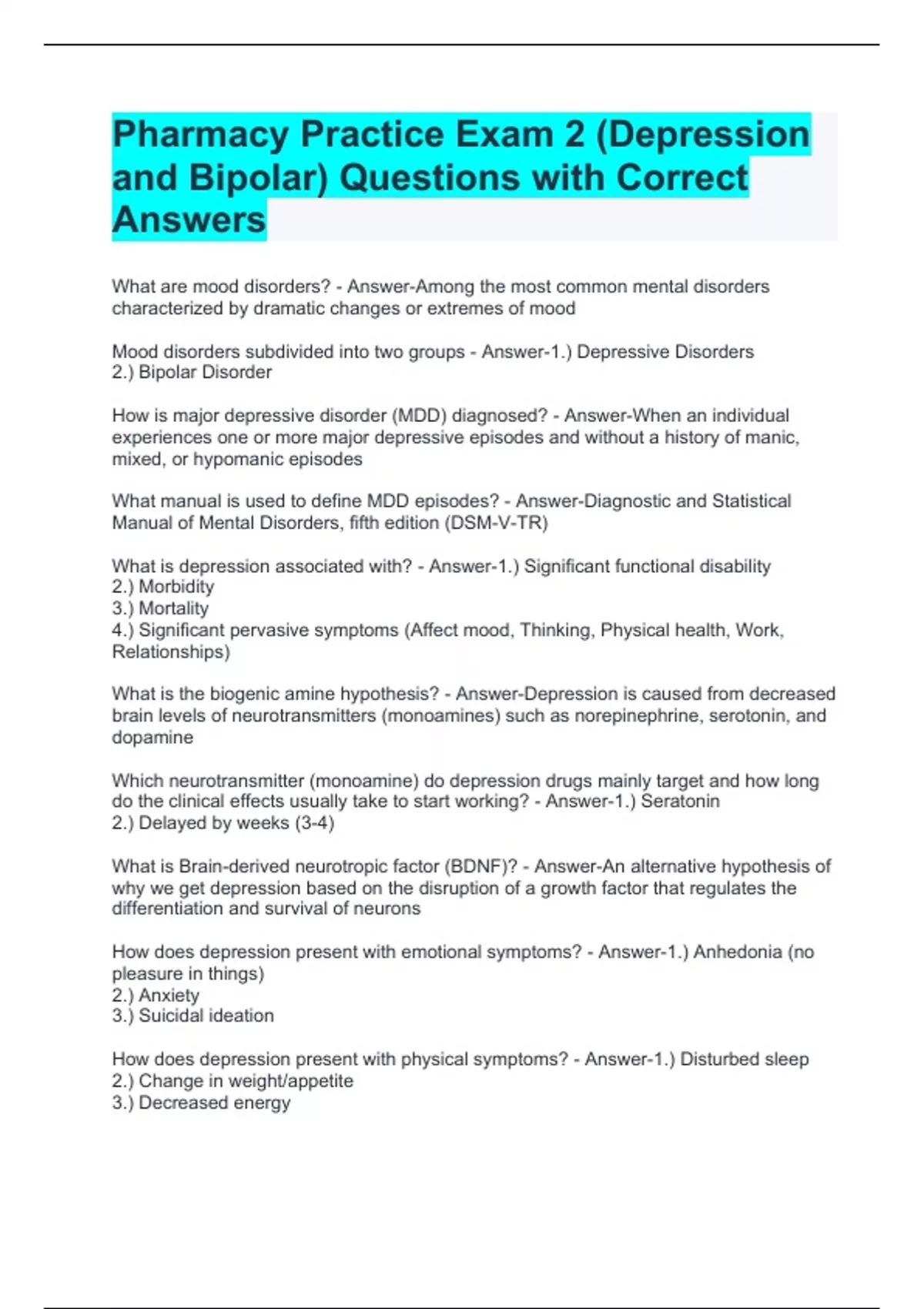What are mood disorders? - Answer-Among the most common mental disorders characterized by dramatic changes or extremes of mood Mood disorders subdivided into two groups - Answer-1.) Depressive Disorders 2.) Bipolar Disorder How is major depressive disorder (MDD) diagnosed? - Answer-When an individual experiences one or more major depressive episodes and without a history of manic, mixed, or hypomanic episodes What manual is used to define MDD episodes? - Answer-Diagnostic and Statistical Manual of Mental Disorders, fifth edition (DSM-V-TR) What is depression associated with? - Answer-1.) Significant functional disability 2.) Morbidity 3.) Mortality 4.) Significant pervasive symptoms (Affect mood, Thinking, Physical health, Work, Relationships) What is the biogenic amine hypothesis? - Answer-Depression is caused from decreased brain levels of neurotransmitters (monoamines) such as norepinephrine, serotonin, and dopamine Which neurotransmitter (monoamine) do depression drugs mainly target and how long do the clinical effects usually take to start working? - Answer-1.) Seratonin 2.) Delayed by weeks (3-4) What is Brain-derived neurotropic factor (BDNF)? - Answer-An alternative hypothesis of why we get depression based on the disruption of a growth factor that regulates the differentiation and survival of neurons How does depression present with emotional symptoms? - Answer-1.) Anhedonia (no pleasure in things) 2.) Anxiety 3.) Suicidal ideation How does depression present with physical symptoms? - Answer-1.) Disturbed sleep 2.) Change in weight/appetite 3.) Decreased energy