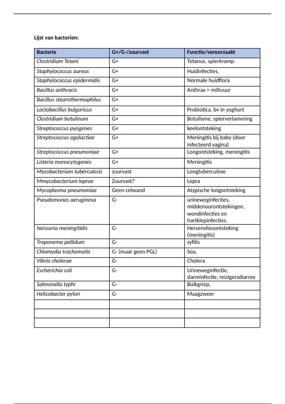 Dit is een lijst van de te kennen bacterien voor het vak microbiologie voor eerste bachelor 2023/2024