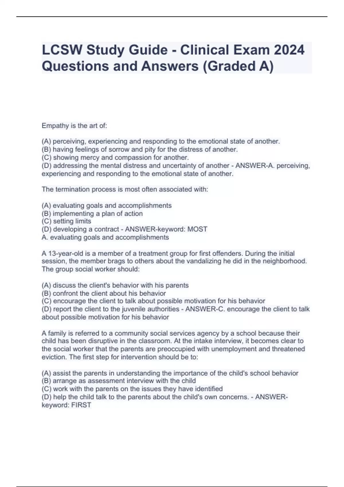 LCSW Study Guide - Clinical Exam 2024 Questions and Answers (Graded A)LCSW Study Guide - Clinical Exam 2024 Questions and Answers (Graded A)LCSW Study Guide - Clinical Exam 2024 Questions and Answers (Graded A)LCSW Study Guide - Clinical Exam 2024 Questions and Answers (Graded A) Empathy is the art of: (A) perceiving, experiencing and responding to the emotional state of another. (B) having feelings of sorrow and pity for the distress of another. (C) showing mercy and compassion for another. (D) addressing the mental distress and uncertainty of another - ANSWER-A. perceiving, experiencing and responding to the emotional state of another. The termination process is most often associated with: (A) evaluating goals and accomplishments (B) implementing a plan of action (C) setting limits (D) developing a contract - ANSWER-keyword: MOST A. evaluating goals and accomplishments