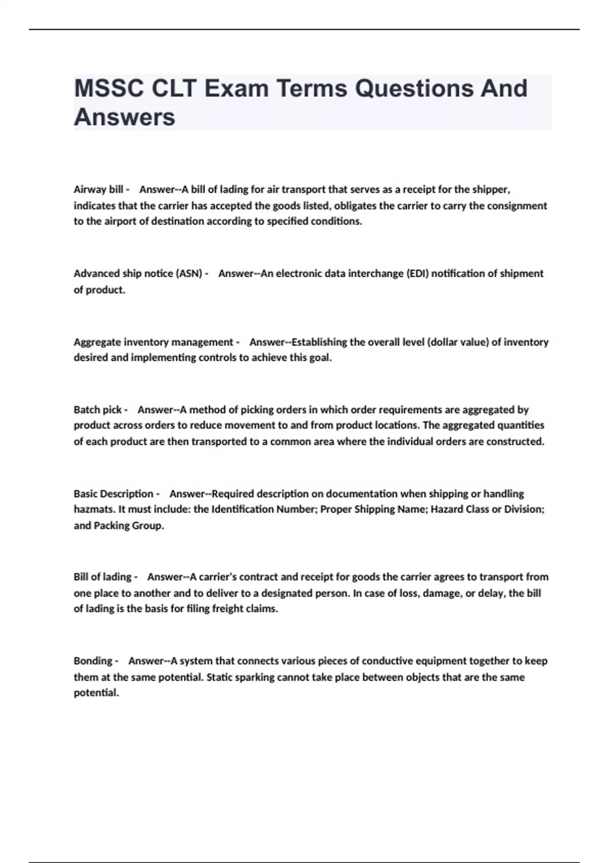 MSSC CLT Exam Terms Questions And Answers