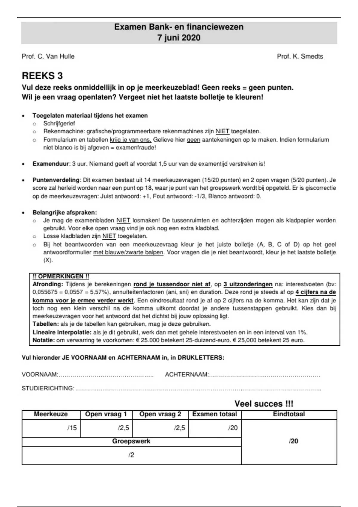 • Puntenverdeling: Dit examen bestaat uit 14 meerkeuzevragen (15/20 punten) en 2 open vragen (5/20 punten). Je