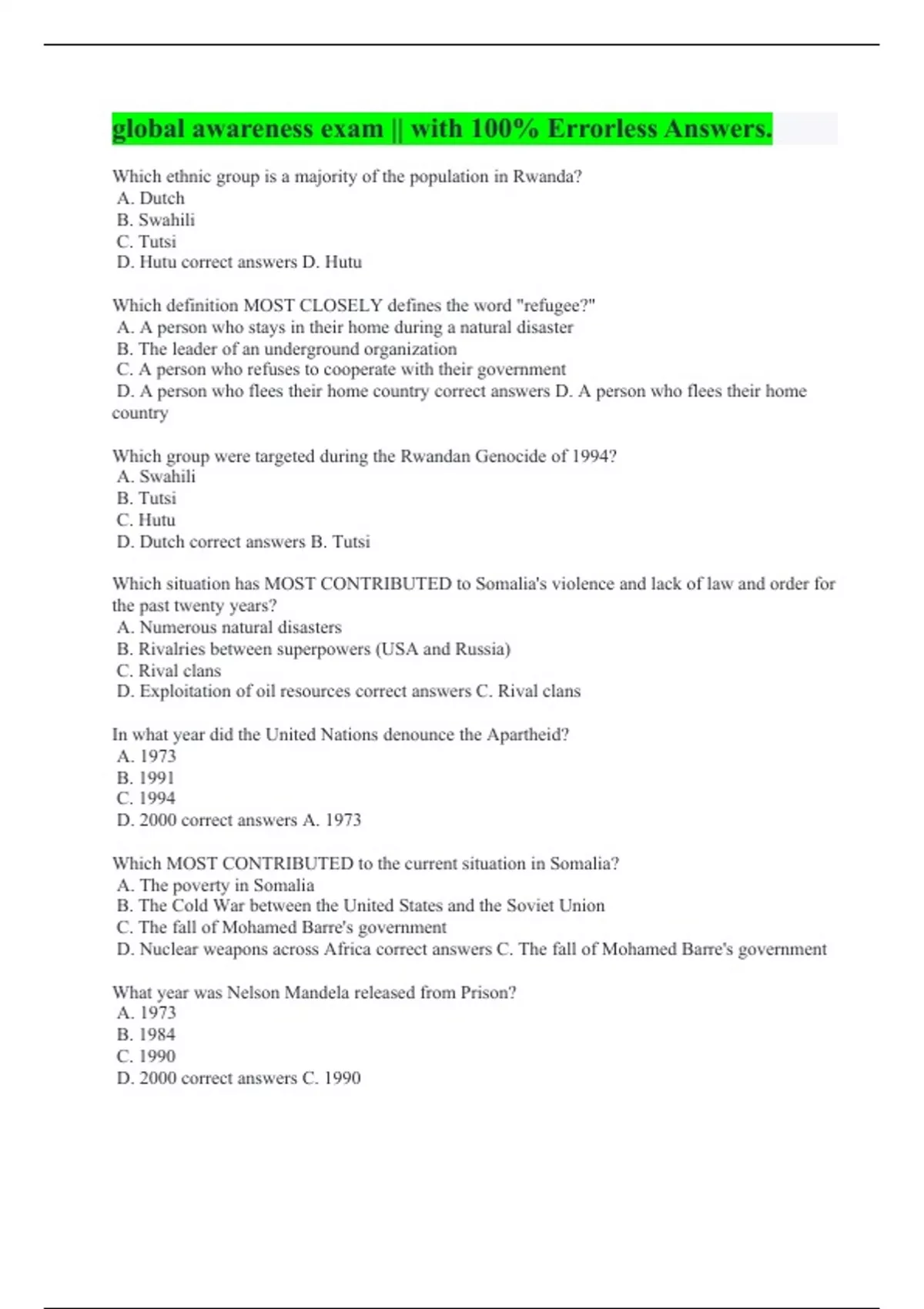 Which ethnic group is a majority of the population in Rwanda? A. Dutch B. Swahili C. Tutsi D. Hutu correct answers D. Hutu Which definition MOST CLOSELY defines the word "refugee?" A. A person who stays in their home during a natural disaster B. The leader of an underground organization C. A person who refuses to cooperate with their government D. A person who flees their home country correct answers D. A person who flees their home country Which group were targeted during the Rwandan Genocide of 1994? A. Swahili B. Tutsi C. Hutu D. Dutch correct answers B. Tutsi Which situation has MOST CONTRIBUTED to Somalia's violence and lack of law and order for the past twenty years? A. Numerous natural disasters B. Rivalries between superpowers (USA and Russia) C. Rival clans D. Exploitation of oil resources correct answers C. Rival clans In what year did the United Nations denounce the Apartheid? A. 1973 B. 1991 C. 1994 D. 2000 correct answers A. 1973 Which MOST CONTRIBUTED to the current situation in Somalia? A. The poverty in Somalia B. The Cold War between the United States and the Soviet Union C. The fall of Mohamed Barre's government D. Nuclear weapons across Africa correct answers C. The fall of Mohamed Barre's government What year was Nelson Mandela released from Prison? A. 1973 B. 1984 C. 1990 D. 2000 correct answers C. 1990
