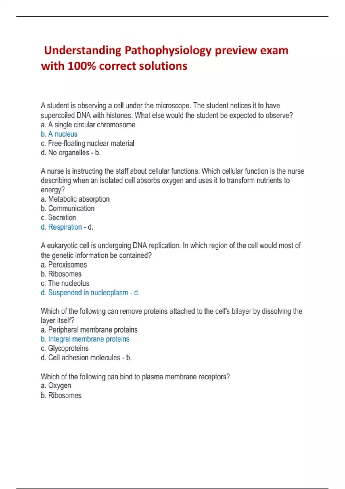 Understanding Pathophysiology preview exam with 100% correct solutions A student is observing a cell under the microscope. The student notices it to have supercoiled DNA with histones. What else would the student be expected to observe? a. A single circular chromosome b. A nucleus c. Free-floating nuclear material d. No organelles - b. A nurse is instructing the staff about cellular functions. Which cellular function is the nurse describing when an isolated cell absorbs oxygen and uses it to transform nutrients to energy? a. Metabolic absorption b. Communication c. Secretion d. Respiration - d. A eukaryotic cell is undergoing DNA replication. In which region of the cell would most of the genetic information be contained? a. Peroxisomes b. Ribosomes c. The nucleolus d. Suspended in nucleoplasm - d. Which of the following can remove proteins attached to the cell's bilayer by dissolving the layer itself? a. Peripheral membrane proteins b. Integral membrane proteins c. Glycoproteins d. Cell adhesion molecules - b. Which of the following can bind to plasma membrane receptors? a. Oxygen b. Ribosomes c. Amphipathic lipids d. Ligands - d. A nurse is reviewing a report from a patient with metastatic cancer. What alternation in the extracellular matrix would support the diagnosis of metastatic cancer? a. Decreased fibronectin b. Increased collagen c. Decreased elastin d. Increased glycoproteins - a. What type of connection allows for cellular communication? a. Belt desmosome b. Gap junction c. Spot desmosome d. Tight junction - b. Pancreatic beta cells secrete insulin, which inhibits secretion of glucagon from neighbouring alpha cells. This action is an example of which of the following signalling types? a. Paracrine b. Autocrine c. Neurohormonal d. Hormonal - a. in cellular metabolism, each enzyme has a high affinity for a: a. solute. b. substrate. c. receptor. d. ribosome. - b. An athlete runs a marathon, after which his muscles feel fatigued and unable to contract. The athlete asks the nurse why this happened. The nurse's response is based on the knowledge that the problem is result of a deficiency of: a. GTP b. AMP c. ATP d. GMP - c. Which phase of catabolism produces the most ATP? a. Digestion b. Glycolysis c. Oxidation d. Citric acid cycle - d. A nurse is teaching the staff about the phases of cellular catabolism. Which phases should the nurse include? a. Digestion, glycolysis, oxidation, and the citric acid cycle b. Diffusion, osmosis, and mediated transport c. S phase, G phase, and M phase d. Metabolic absorption, respiration, and excretion - a.