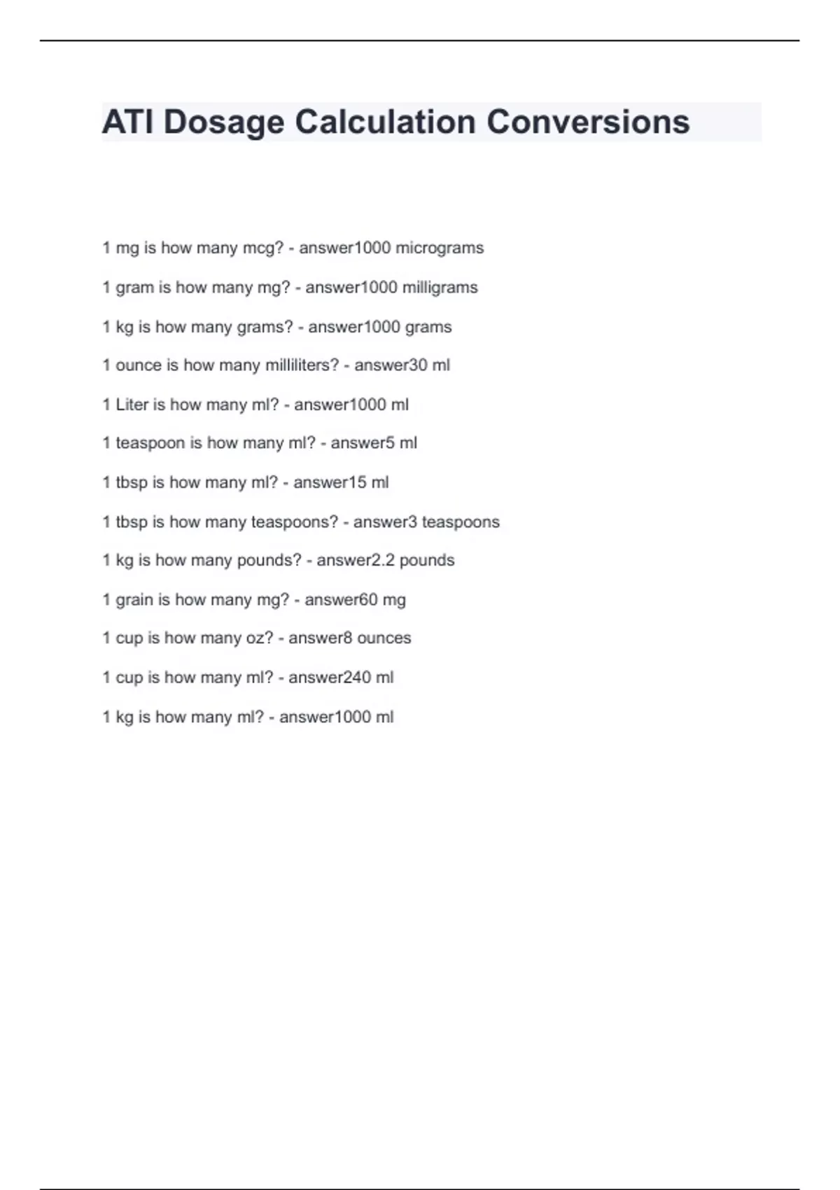 ATI Dosage Calculation Conversions Questions and Answers 100% Solved
