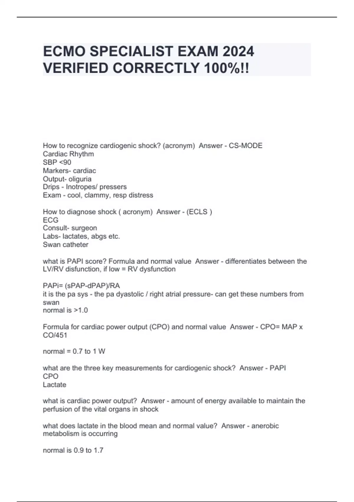 Formula for cardiac power output (CPO) and normal value Answer - CPO= MAP x CO/451 normal = 0.7 to 1 W