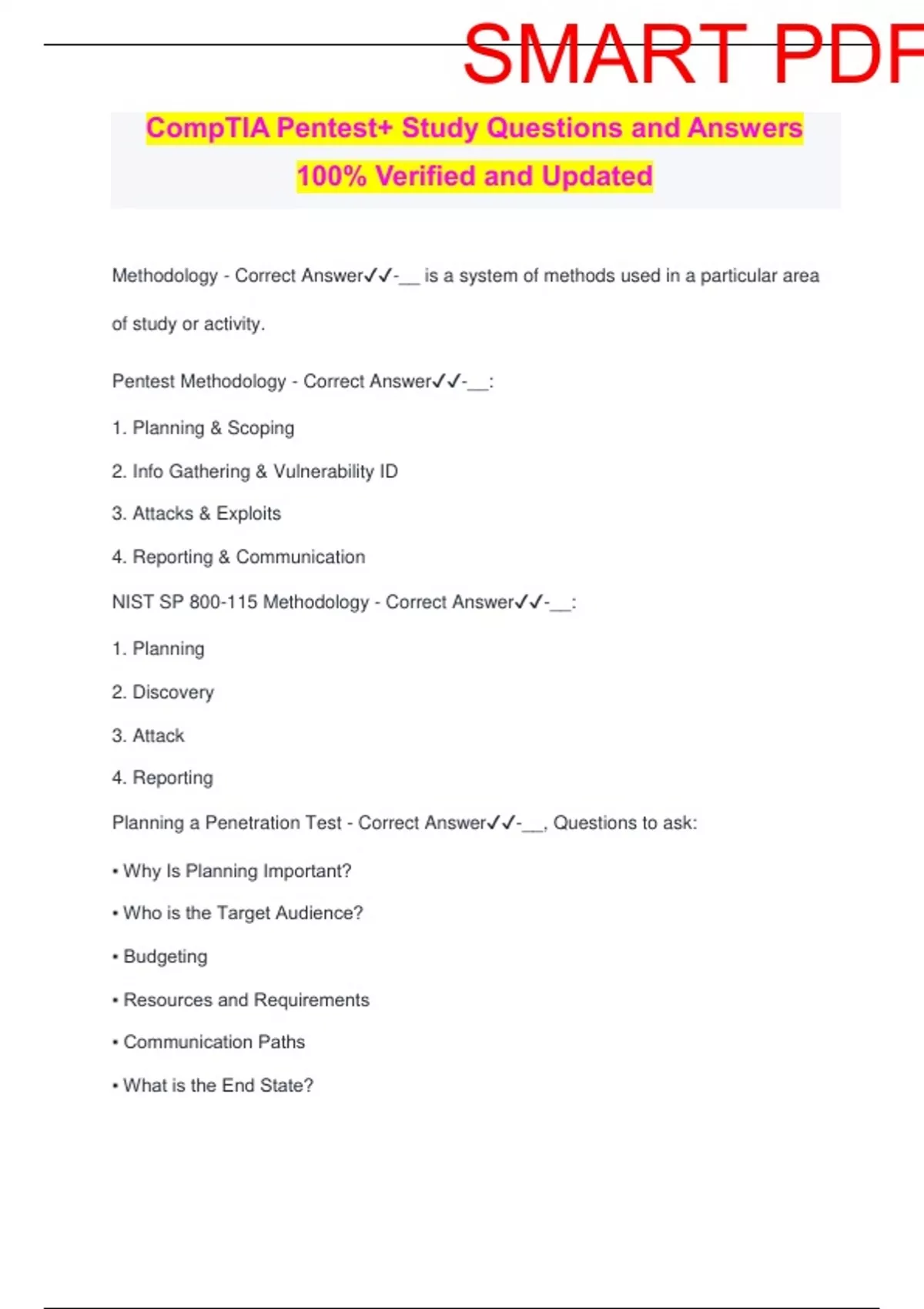 CompTIA Pentest+ Study Questions and Answers 100% Verified and Updated Methodology - Correct Answer️️ -__ is a system of methods used in a particular area of study or activity. Pentest Methodology - Correct Answer️️ -__: 1. Planning & Scoping 2. Info Gathering & Vulnerability ID 3. Attacks & Exploits 4. Reporting & Communication NIST SP 800-115 Methodology - Correct Answer️️ -__: 1. Planning 2. Discovery 3. Attack 4. Reporting Planning a Penetration Test - Correct Answer️️ -__, Questions to ask: ▪ Why Is Planning Important? ▪ Who is the Target Audience? ▪ Budgeting ▪ Resources and Requirements ▪ Communication Paths ▪ What is the End State?SMART PDF ▪ Technical Constraints ▪ Disclaimers Planning a Penetration Test - Budgeting - Correct Answer️️ -__: ▪ Controls many factors in a test ▪ If you have a large budget, you can perform a more in-depth test __● Increased timeline for testing __● Increased scope __● Increased resources (people, tech, etc.) Planning a Penetration Test - Resources and Requirements - Correct Answer️️ -__: ▪ What resources will the assessment require? ▪ What requirements will be met in the testing? __● Confidentiality of findings __● Known vs. unknown vulnerabilities __● Compliance-based assessment Planning a Penetration Test - Communication Paths - Correct Answer️️ -__: ▪ Who do we communicate with about the test? ▪ What info will be communicated and when? ▪ Who is a trusted agent if testing goes wrong? Planning a Penetration Test - What is the End State? - Correct Answer️️ -__:SMART PDF ▪ What kind of report will be provided after test? ▪ Will you provide an estimate of how long remediations would take? Planning a Penetration Test - Technical Constraints - Correct Answer️️ -__: ▪ What constraints limited your ability to test?