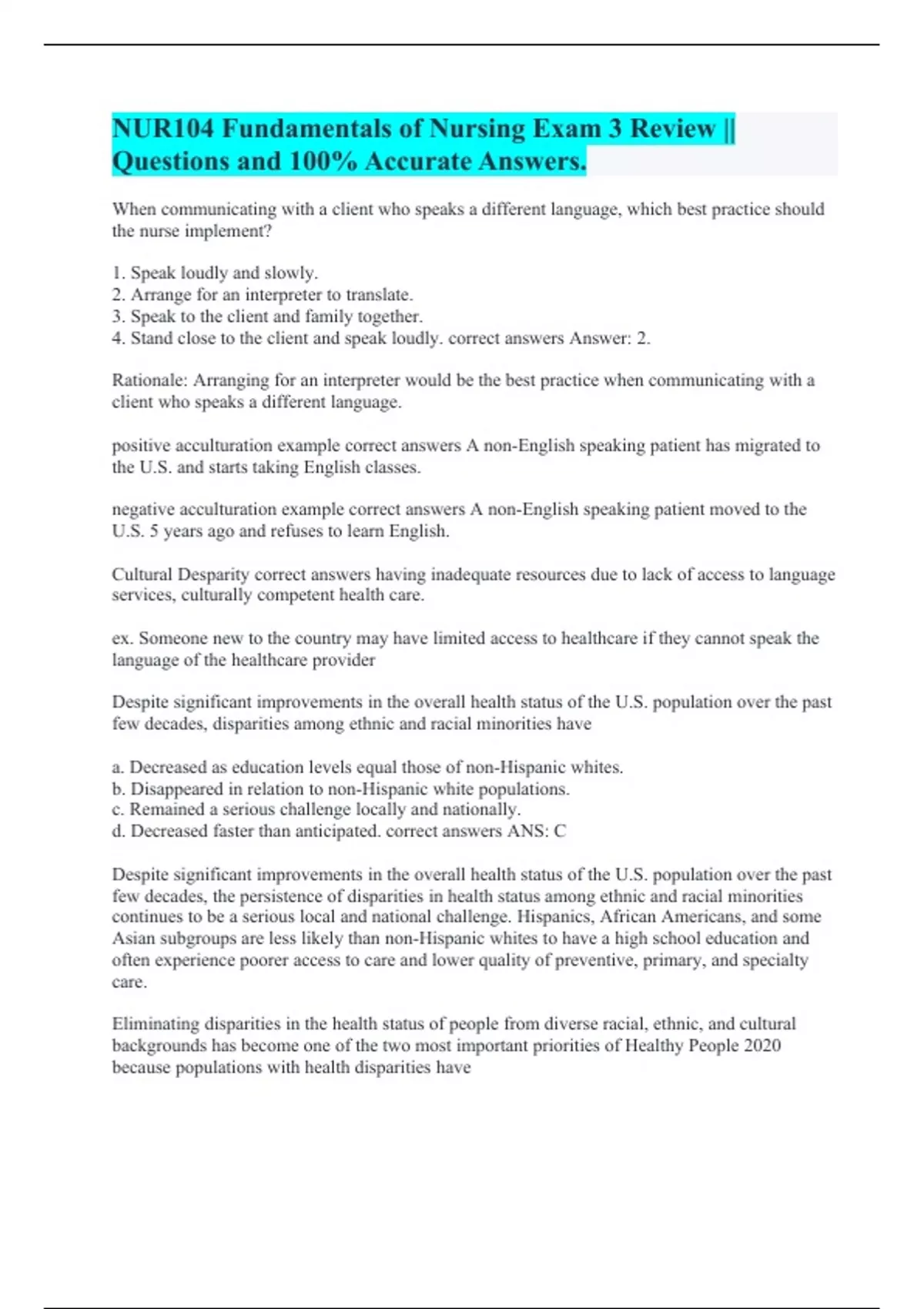 When communicating with a client who speaks a different language, which best practice should the nurse implement? 1. Speak loudly and slowly. 2. Arrange for an interpreter to translate. 3. Speak to the client and family together. 4. Stand close to the client and speak loudly. correct answers Answer: 2. Rationale: Arranging for an interpreter would be the best practice when communicating with a client who speaks a different language. positive acculturation example correct answers A non-English speaking patient has migrated to the U.S. and starts taking English classes. negative acculturation example correct answers A non-English speaking patient moved to the U.S. 5 years ago and refuses to learn English. Cultural Desparity correct answers having inadequate resources due to lack of access to language services, culturally competent health care. ex. Someone new to the country may have limited access to healthcare if they cannot speak the language of the healthcare provider Despite significant improvements in the overall health status of the U.S. population over the past few decades, disparities among ethnic and racial minorities have a. Decreased as education levels equal those of non-Hispanic whites. b. Disappeared in relation to non-Hispanic white populations. c. Remained a serious challenge locally and nationally. d. Decreased faster than anticipated. correct answers ANS: C Despite significant improvements in the overall health status of the U.S. population over the past few decades, the persistence of disparities in health status among ethnic and racial minorities continues to be a serious local and national challenge. Hispanics, African Americans, and some Asian subgroups are less likely than non-Hispanic whites to have a high school education and often experience poorer access to care and lower quality of preventive, primary, and specialty care. Eliminating disparities in the health status of people from diverse racial, ethnic, and cultural backgrounds has become one of the two most important priorities of Healthy People 2020 because populations with health disparities have
