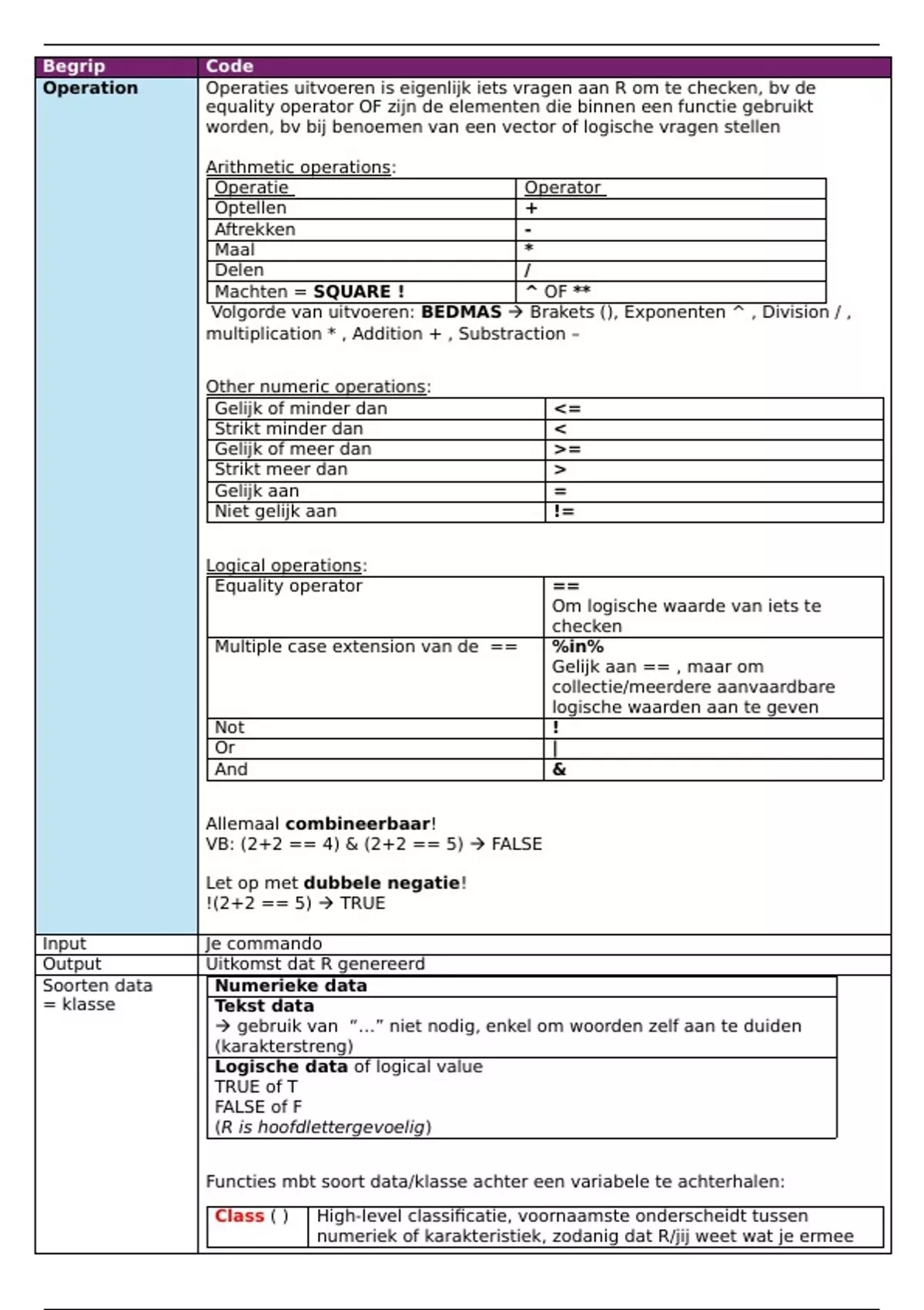 Alle formules, te gebruiken in R, worden hier in een tabel weergegeven. Codes en belangrijke begrippen worden in het vet en rood weergegeven zodat ze duidelijk opvallen. Elke functie heeft een korte maar duidelijke uitleg alsook een concreet voorbeeld. De kader is licht blauw gekleurd als het een belangrijk onderdeeltje bevat. Ook info en tips uit de practica zijn geïmplementeerd in het overzicht! Veel succes ermee!