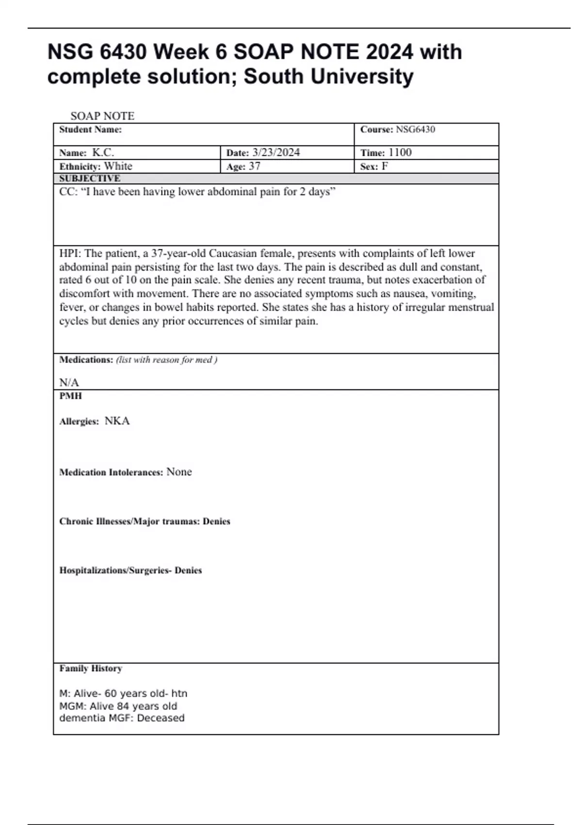 NSG 6430 Week 6 SOAP NOTE 2024 with complete solution; South University HPI: The patient, a 37-year-old Caucasian female, presents with complaints of left lower abdominal pain persisting for the last two days. The pain is described as dull and constant, rated 6 out of 10 on the pain scale. She denies any recent trauma, but notes exacerbation of discomfort with movement. There are no associated symptoms such as nausea, vomiting, fever, or changes in bowel habits reported. She states she has a history of irregular menstrual cycles but denies any prior occurrences of similar pain.