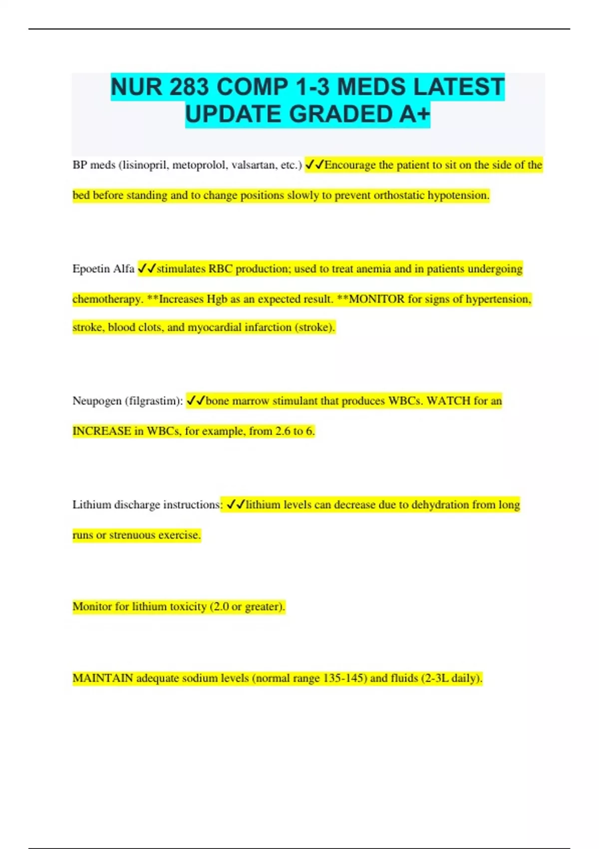 NUR 283 COMP 1-3 MEDS LATEST UPDATE GRADED A+