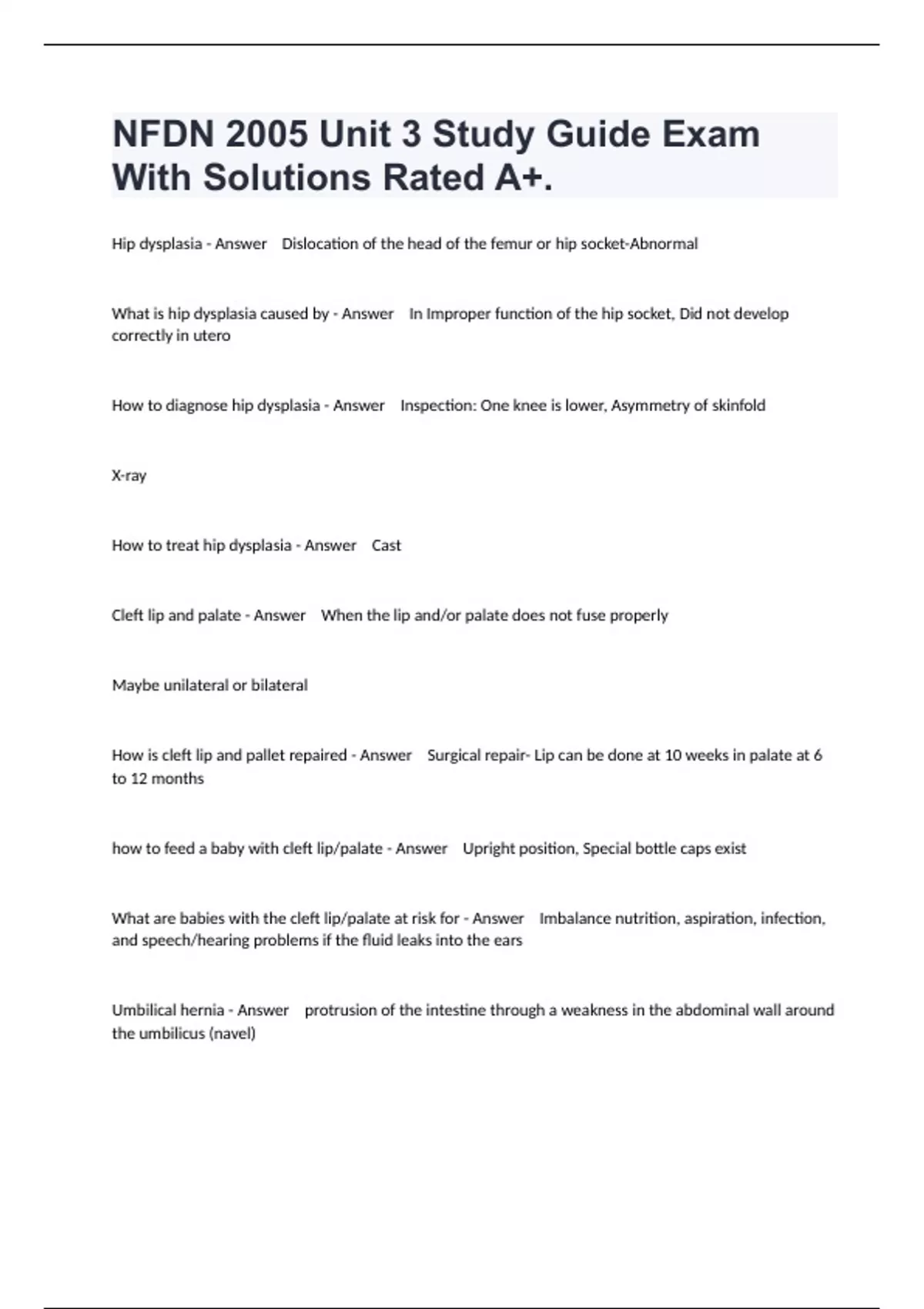 Hip dysplasia - Answer Dislocation of the head of the femur or hip socket-Abnormal What is hip dysplasia caused by - Answer In Improper function of the hip socket, Did not develop correctly in utero How to diagnose hip dysplasia - Answer Inspection: One knee is lower, Asymmetry of skinfold X-ray How to treat hip dysplasia - Answer Cast Cleft lip and palate - Answer When the lip and/or palate does not fuse properly Maybe unilateral or bilateral How is cleft lip and pallet repaired - Answer Surgical repair- Lip can be done at 10 weeks in palate at 6 to 12 months how to feed a baby with cleft lip/palate - Answer Upright position, Special bottle caps exist What are babies with the cleft lip/palate at risk for - Answer Imbalance nutrition, aspiration, infection, and speech/hearing problems if the fluid leaks into the ears Umbilical hernia - Answer protrusion of the intestine through a weakness in the abdominal wall around the umbilicus (navel)