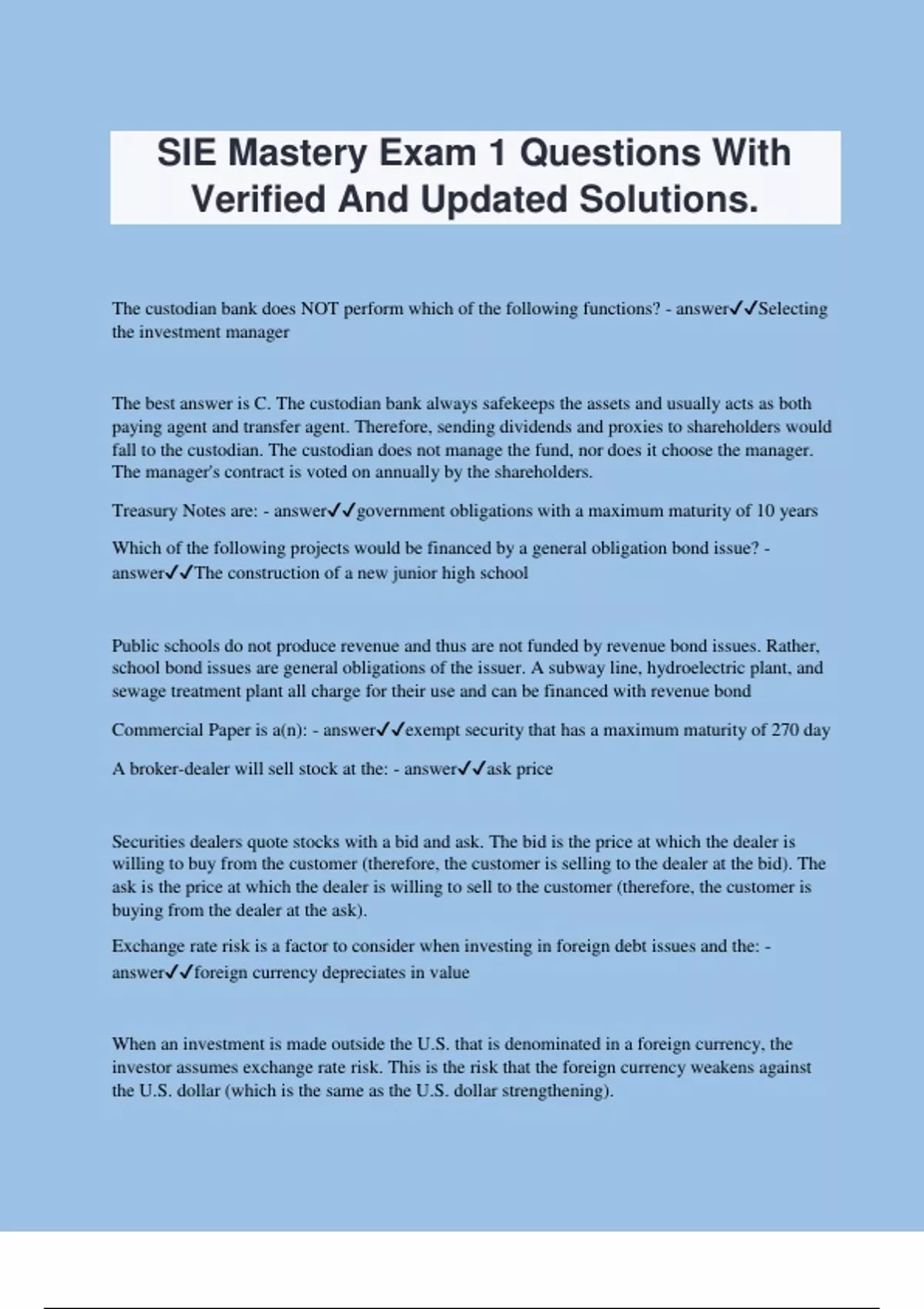 SIE Mastery Exam 1 Questions With Verified And Updated Solutions. The custodian bank does NOT perform which of the following functions? - answerSelecting the investment manager The best answer is C. The custodian bank always safekeeps the assets and usually acts as both paying agent and transfer agent. Therefore, sending dividends and proxies to shareholders would fall to the custodian. The custodian does not manage the fund, nor does it choose the manager. The manager's contract is voted on annually by the shareholders. Treasury Notes are: - answergovernment obligations with a maximum maturity of 10 years Which of the following projects would be financed by a general obligation bond issue? - answerThe construction of a new junior high school Public schools do not produce revenue and thus are not funded by revenue bond issues. Rather, school bond issues are general obligations of the issuer. A subway line, hydroelectric plant, and sewage treatment plant all charge for their use and can be financed with revenue bond Commercial Paper is a(n): - answerexempt security that has a maximum maturity of 270 day A broker-dealer will sell stock at the: - answerask price Securities dealers quote stocks with a bid and ask. The bid is the price at which the dealer is willing to buy from the customer (therefore, the customer is selling to the dealer at the bid). The ask is the price at which the dealer is willing to sell to the customer (therefore, the customer is buying from the dealer at the ask). Exchange rate risk is a factor to consider when investing in foreign debt issues and the: - answerforeign currency depreciates in value When an investment is made outside the U.S. that is denominated in a foreign currency, the investor assumes exchange rate risk. This is the risk that the foreign currency weakens against the U.S. dollar (which is the same as the U.S. dollar strengthening). For example, assume that an investment is made in $100,000 of bonds denominated in Japanese Yen when the Yen is trading at 100 to the U.S. dollar. Thus, $100,000 x 100 Yen per U.S. dollar = 1,000,000 Yen being spent. Also assume that each bond costs 10,000 Yen, so 100 bonds are purchased at $100 each. Now assume that the bonds do not move in price, but the Yen weakens to 200 Yen to the U.S. dollar (each U.S. dollar now "buys" 200 Yen instead of 100 Yen). This means that 100 bonds are still priced at 10,000 Yen each in Japan. However, because each U.S. dollar is worth 200 Yen, the bonds are now worth 10,000 Yen / 200 Yen per U.S. dollar = $50 each. Thus, the bonds are now worth 1/2 of what was paid for them, solely due to the movement in currency exchange rates. An investor purchases a $1,000 convertible bond at 80. The bond is convertible into common at $20 per share. The current market price of the common is $10 per share. If the investor were to convert, he or she would receive how many shares of common stock? - answer50 Conversion is based on the par value of the bond, which is $1,000. The investor can convert at $20 per share, so upon conversion, the investor would receive $1,000 par / $20 conversion price = 50 shares. The purchase price of each of the following can be negotiated EXCEPT: - answerSavings bond Savings bonds are non-negotiable - they do not trade. Commercial paper, certificates of deposit, and banker's acceptances are all money market instruments that are negotiable (i.e., trade in the market). Which industry is most susceptible to swings in market interest rates? - answerUtilities are capital intensive - building electric generating plants is expensive! To obtain long term funds, utilities can issue either stock or bonds. Because their revenue stream is stable, utilities can issue large amounts of bonds at favorable interest rates without negatively affecting their credit rating. A corporation has issued 10%, $1,000 par convertible debentures, convertible at $31.25. The common stock is currently trading at $35. If the bond and the common are trading at parity, a customer purchasing 5M of the bonds will pay: - answer5600 The bonds are convertible at $31.25, based on $1,000 par value. Therefore each bond converts into 32 shares ($1,000 par / $31.25 conversion price). If the common is trading at $35, the bond must be trading at 32 times this to be at parity. $35 x 32 = $1,120 parity price of one bond. The parity price of "5M" ($5,000 face amount, "M" is Latin for $1,000) is $1,120 x 5 = $5,600. How are Treasury Notes quoted? - answerWhole and Fractional