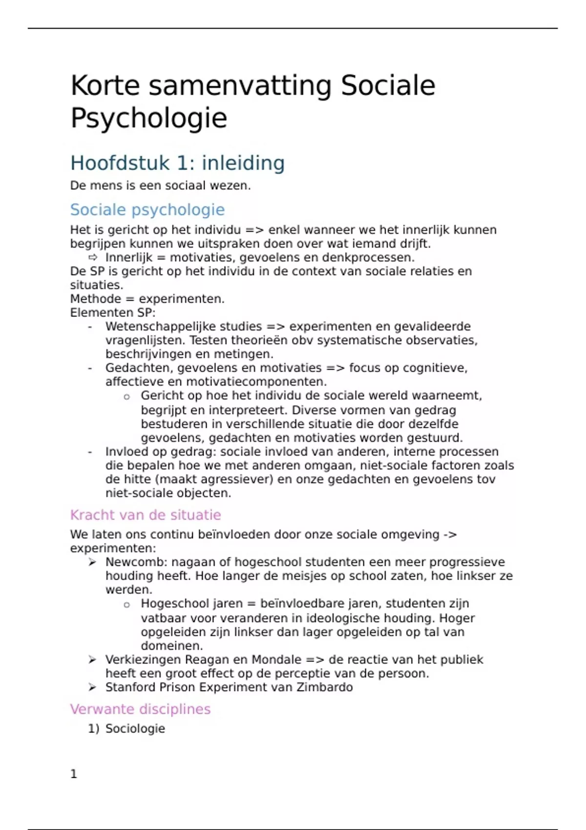Deze samenvatting omvat alle hoofdstukken die gekend moeten zijn voor het vak sociale psychologie. Het bevat de belangrijkste zaken die in de les zijn benadrukt. Ik heb een 16/20 gehaald met de samenvatting. Ik heb het vak geleerd met mijn meer uitgebreide samenvatting, en deze samenvatting als herhaling van alle meest belangrijke zaken voor het examen.