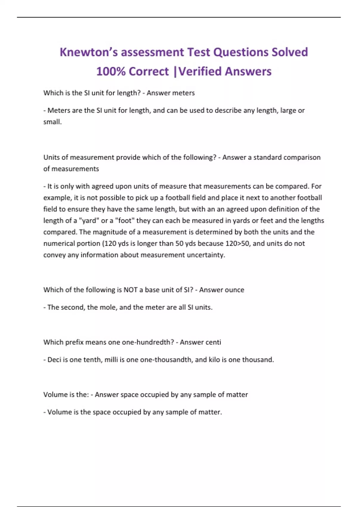 Which is the SI unit for length? - Answer meters - Meters are the SI unit for length, and can be used to describe any length, large or small. Units of measurement provide which of the following? - Answer a standard comparison of measurements - It is only with agreed upon units of measure that measurements can be compared. For example, it is not possible to pick up a football field and place it next to another football field to ensure they have the same length, but with an an agreed upon definition of the length of a "yard" or a "foot" they can each be measured in yards or feet and the lengths compared. The magnitude of a measurement is determined by both the units and the numerical portion (120 yds is longer than 50 yds because 120>50, and units do not convey any information about measurement uncertaint