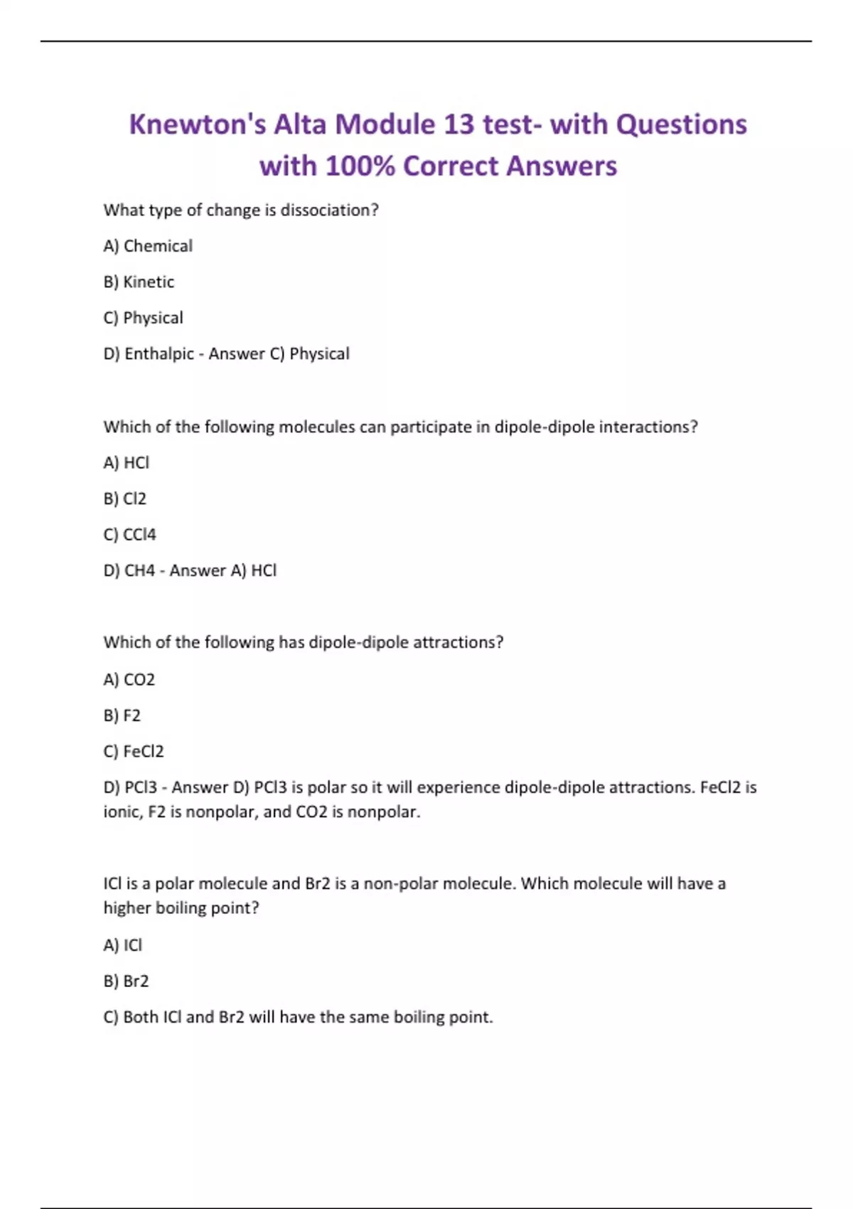 What type of change is dissociation? A) Chemical B) Kinetic C) Physical D) Enthalpic - Answer C) Physical Which of the following molecules can participate in dipole-dipole interactions? A) HCl B) Cl2 C) CCl4 D) CH4 - Answer A) HCl