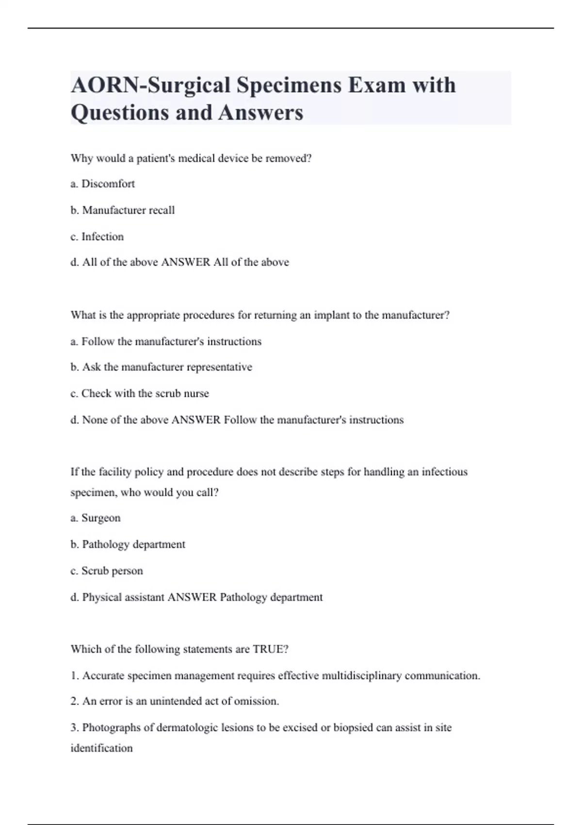 AORN-Surgical Specimens Exam with Questions and Answers Why would a patient's medical device be removed? a. Discomfort b. Manufacturer recall c. Infection d. All of the above ANSWER All of the above What is the appropriate procedures for returning an implant to the manufacturer? a. Follow the manufacturer's instructions b. Ask the manufacturer representative c. Check with the scrub nurse d. None of the above ANSWER Follow the manufacturer's instructions If the facility policy and procedure does not describe steps for handling an infectious specimen, who would you call? a. Surgeon b. Pathology department c. Scrub person d. Physical assistant ANSWER Pathology department Which of the following statements are TRUE? 1. Accurate specimen management requires effective multidisciplinary communication. 2. An error is an unintended act of omission. 3. Photographs of dermatologic lesions to be excised or biopsied can assist in site identification