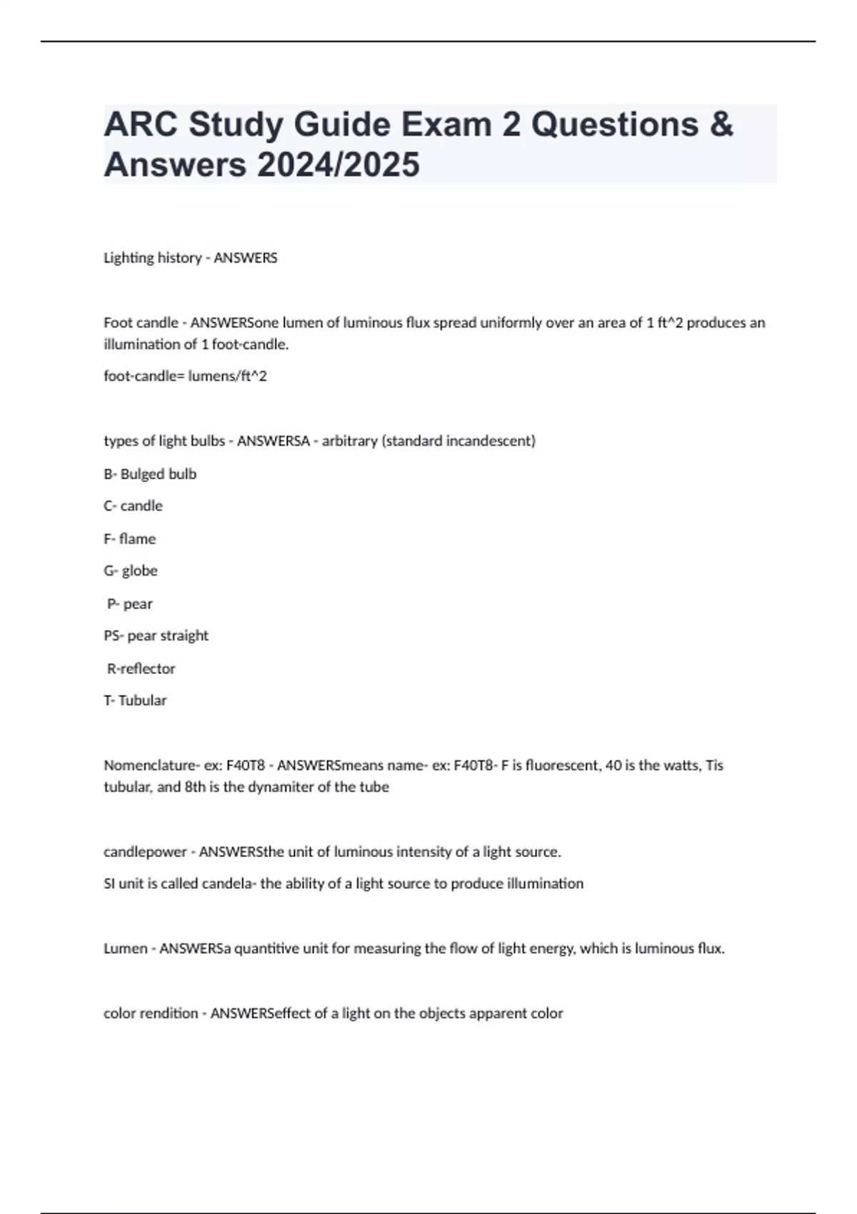 ARC Study Guide Exam 2 Questions & Answers 2024/2025 Lighting history - ANSWERS Foot candle - ANSWERSone lumen of luminous flux spread uniformly over an area of 1 ft^2 produces an illumination of 1 foot-candle. foot-candle= lumens/ft^2 types of light bulbs - ANSWERSA - arbitrary (standard incandescent) B- Bulged bulb C- candle F- flame G- globe P- pear PS- pear straight R-reflector T- Tubular Nomenclature- ex: F40T8 - ANSWERSmeans name- ex: F40T8- F is fluorescent, 40 is the watts, Tis tubular, and 8th is the dynamiter of the tube candlepower - ANSWERSthe unit of luminous intensity of a light source. SI unit is called candela- the ability of a light source to produce illumination Lumen - ANSWERSa quantitive unit for measuring the flow of light energy, which is luminous flux. color rendition - ANSWERSeffect of a light on the objects apparent color