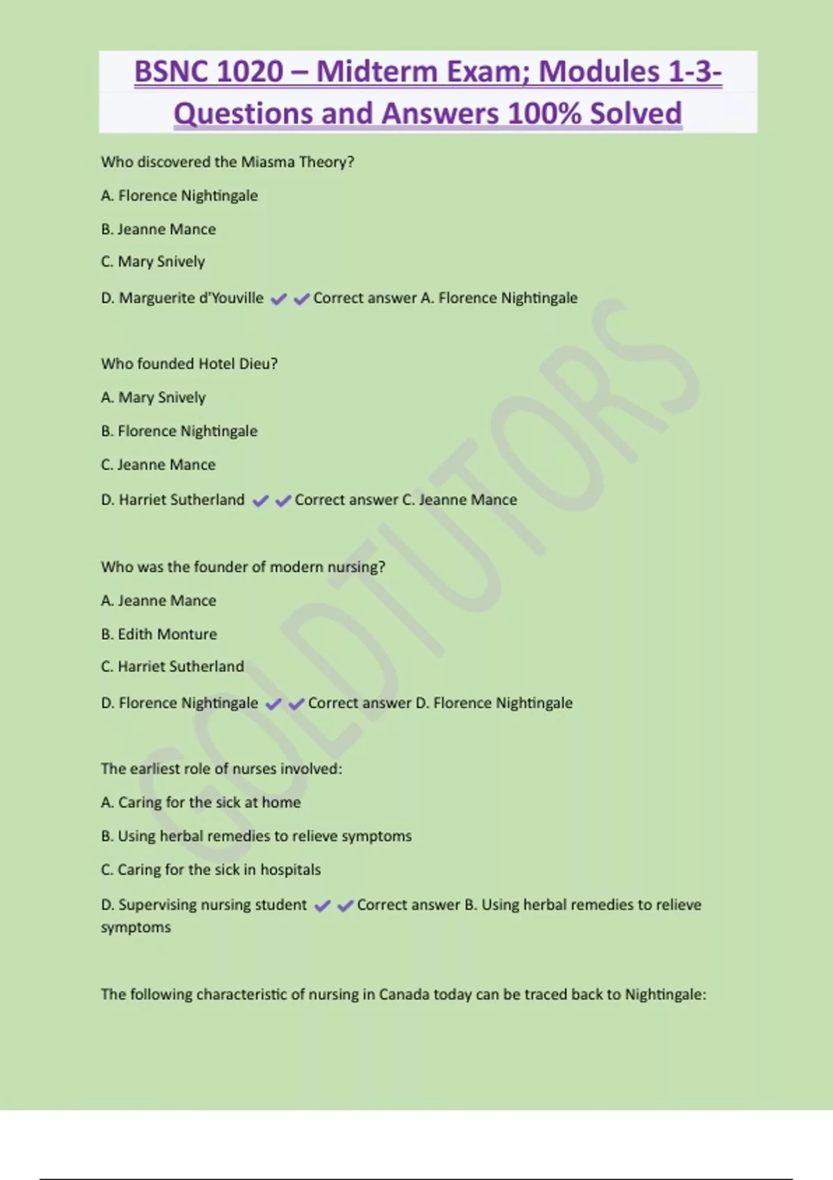 BSNC 1020 – Midterm Exam; Modules 1-3- Questions and Answers 100% Solved Who discovered the Miasma Theory? A. Florence Nightingale B. Jeanne Mance C. Mary Snively D. Marguerite d'Youville Correct answer A. Florence Nightingale Who founded Hotel Dieu? A. Mary Snively B. Florence Nightingale C. Jeanne Mance D. Harriet Sutherland Correct answer C. Jeanne Mance