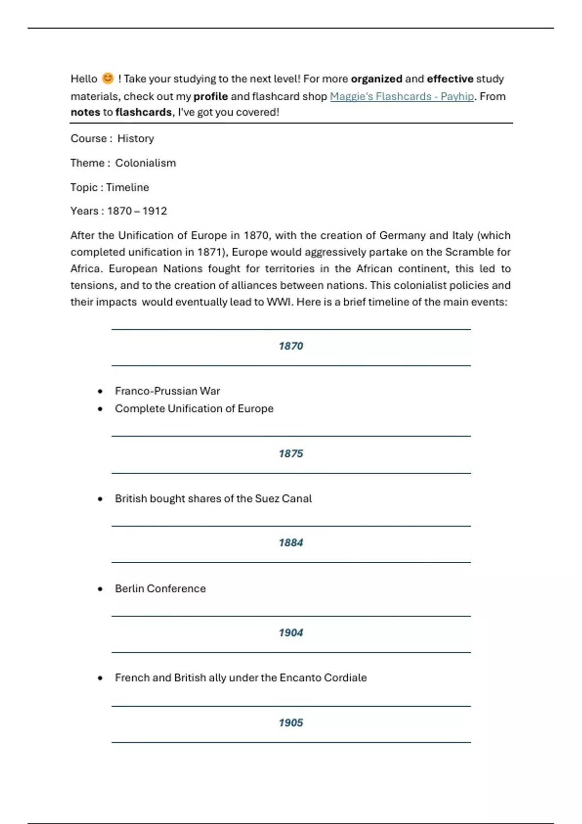 their impacts would eventually lead to WWI. Here is a brief timeline of the main events: