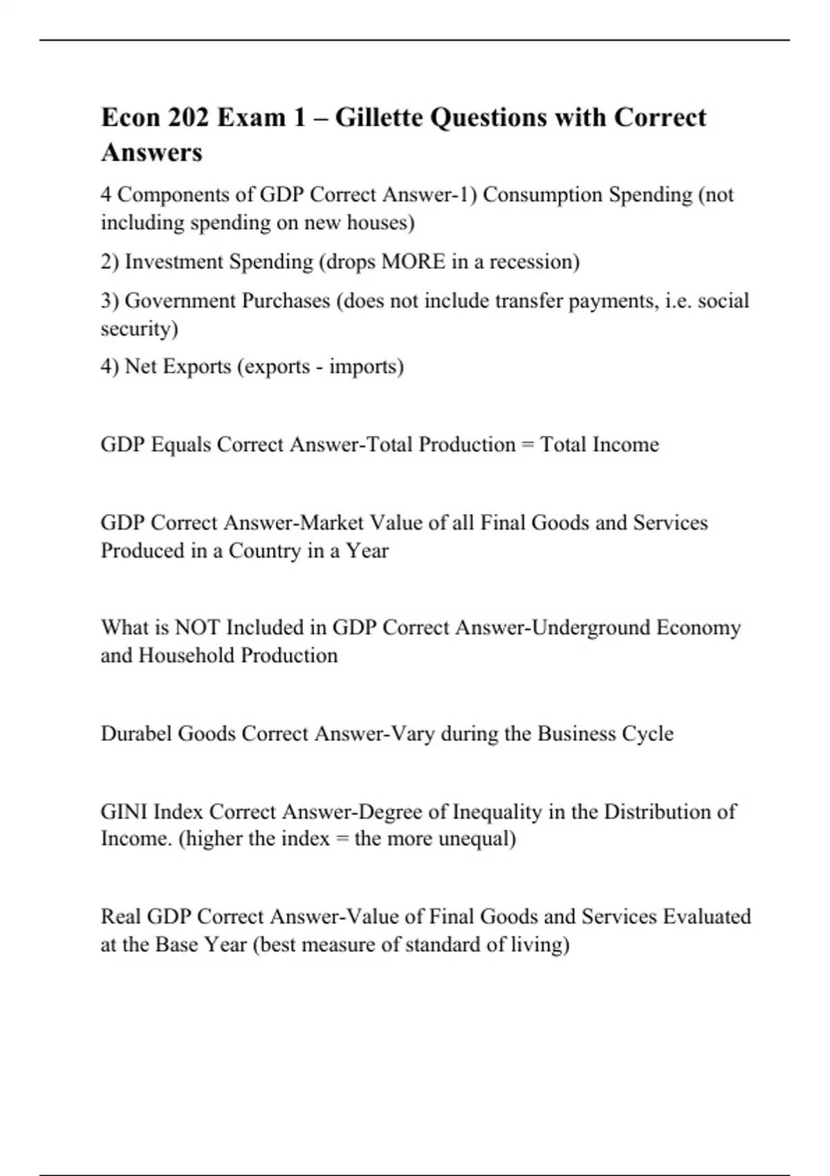4 Components of GDP Correct Answer-1) Consumption Spending (not including spending on new houses) 2) Investment Spending (drops MORE in a recession) 3) Government Purchases (does not include transfer payments, i.e. social security) 4) Net Exports (exports - imports) GDP Equals Correct Answer-Total Production = Total Income GDP Correct Answer-Market Value of all Final Goods and Services Produced in a Country in a Year What is NOT Included in GDP Correct Answer-Underground Economy and Household Production Durabel Goods Correct Answer-Vary during the Business Cycle GINI Index Correct Answer-Degree of Inequality in the Distribution of Income. (higher the index = the more unequal)