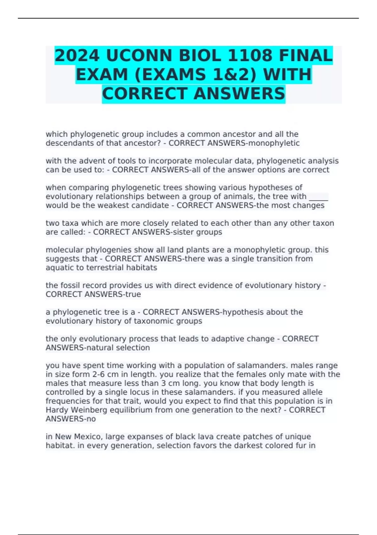 2024 UCONN BIOL 1108 FINAL EXAM (EXAMS 1&2) WITH CORRECT ANSWERS