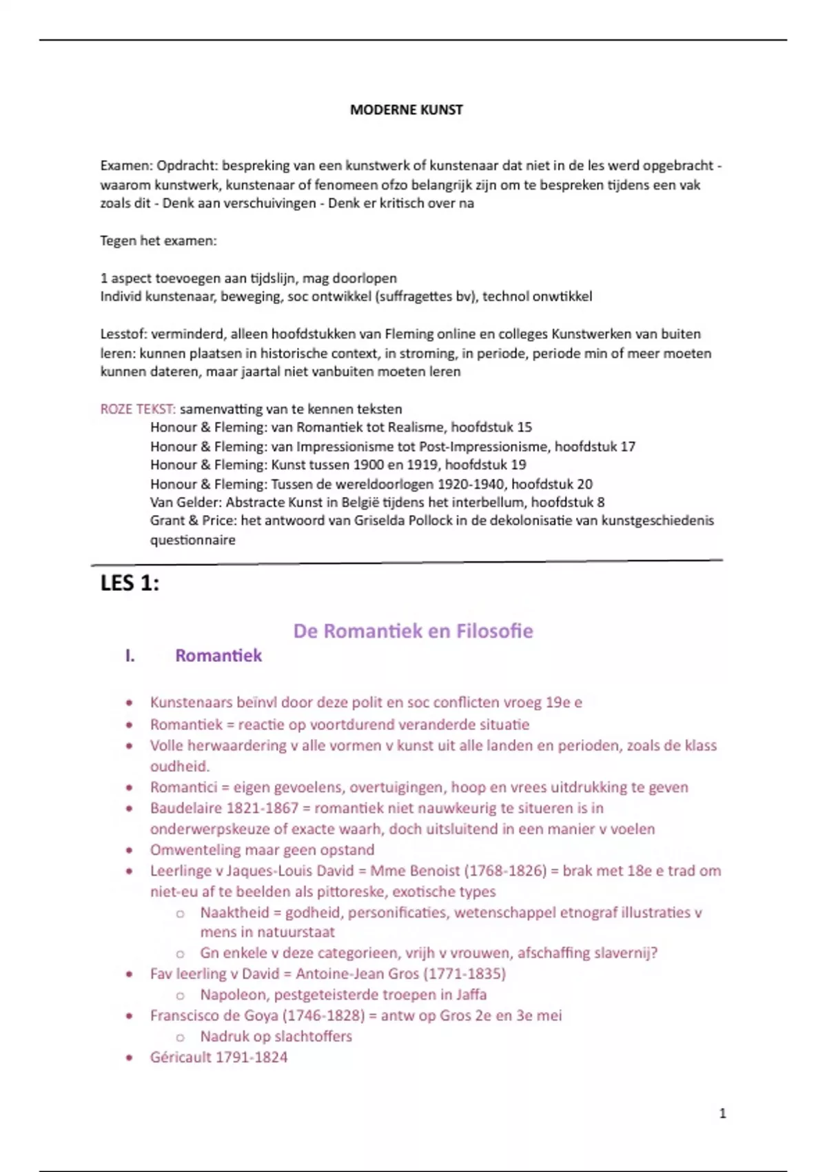 Dit document bevat samenvattingen van de verplichte teksten, namelijk: - Honour & Fleming: van Romantiek tot Realisme (hoofdstuk 15), van Impressionisme tot Post-Impressionisme (hoofdstuk 17), Kunst tussen 1900 en 1919 (hoofdstuk 19), Tussen de wereldoorlogen (hoofdstuk 20) - Van Gelder: Abstracte Kunst in België tijdens het interbellum, hoofdstuk 8 - Grant & Price: het antwoord van Griselda Pollock in de dekolonisatie van kunstgeschiedenis questionnaire Het bevat ook college aantekeningen van les 1-8, elk kunstwerk uit de PPTs dat gekend moeten zijn en examenopdracht tips. Ik behaalde hiervoor een 17/20. Gedoceerd door Professor Sanne Fleur Sinnige.
