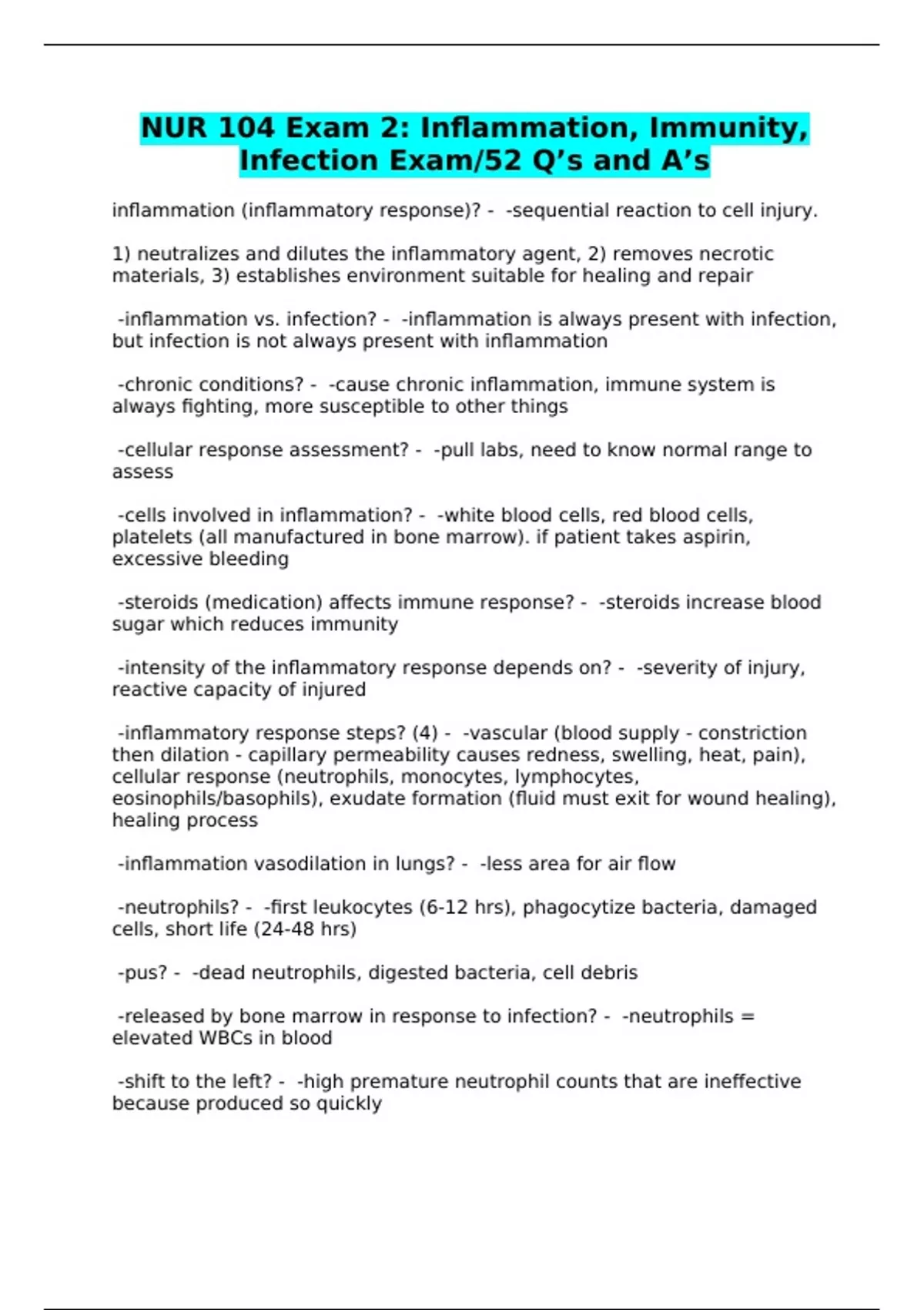 NUR 104 Exam 2: Inflammation, Immunity,