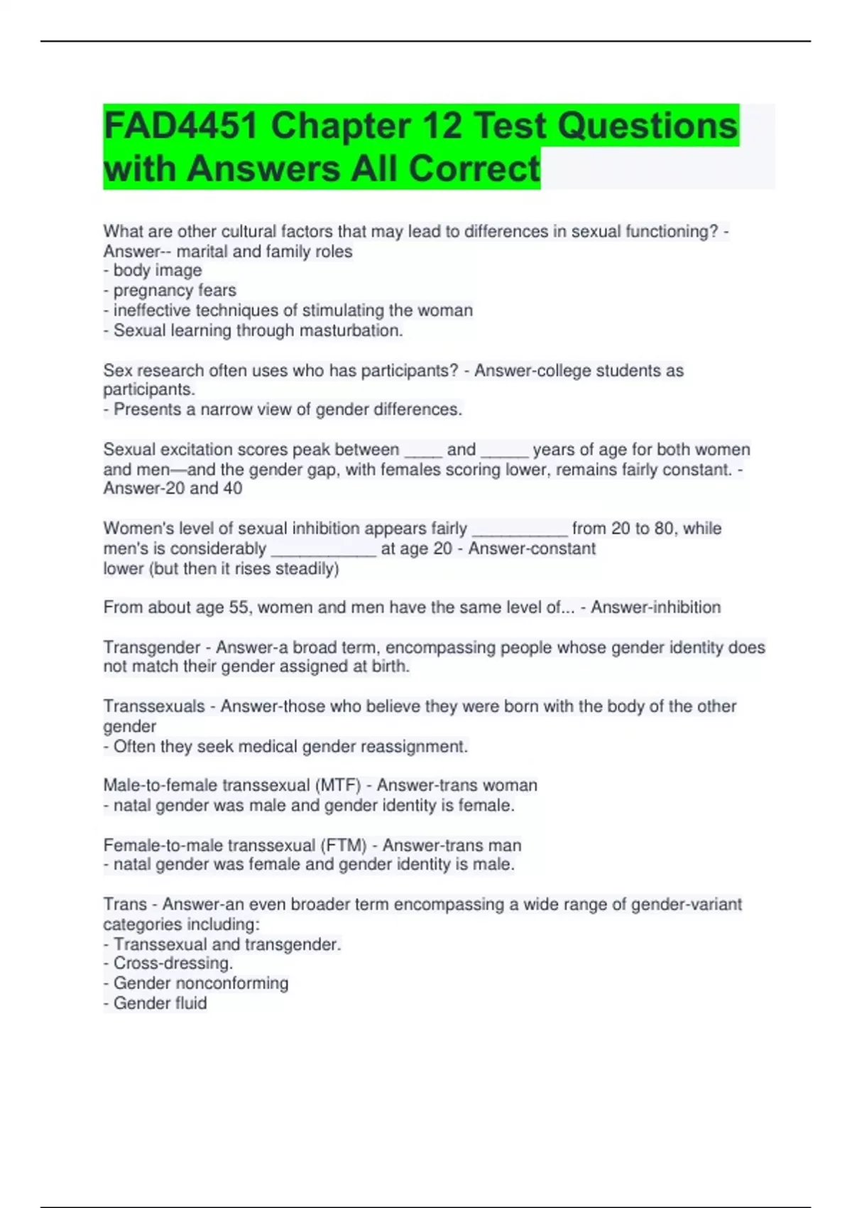 FAD4451 Chapter 12 Test Questions with Answers All Correct What are other cultural factors that may lead to differences in sexual functioning? - Answer-- marital and family roles - body image - pregnancy fears - ineffective techniques of stimulating the woman - Sexual learning through masturbation. Sex research often uses who has participants? - Answer-college students as participants. - Presents a narrow view of gender differences. Sexual excitation scores peak between ____ and _____ years of age for both women and men—and the gender gap, with females scoring lower, remains fairly constant. - Answer-20 and 40 Women's level of sexual inhibition appears fairly __________ from 20 to 80, while men's is considerably ___________ at age 20 - Answer-constant lower (but then it rises steadily) From about age 55, women and men have the same level of... - Answer-inhibition Transgender - Answer-a broad term, encompassing people whose gender identity does not match their gender assigned at birth. Transsexuals - Answer-those who believe they were born with the body of the other gender - Often they seek medical gender reassignment. Male-to-female transsexual (MTF) - Answer-trans woman - natal gender was male and gender identity is female. Female-to-male transsexual (FTM) - Answer-trans man - natal gender was female and gender identity is male.