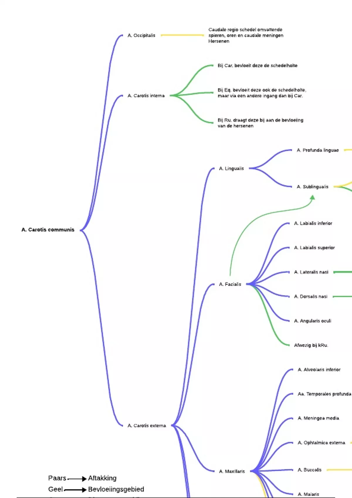 Mindmap met de arteriën en bevloeiingsgebieden van de kop uit de cursus.