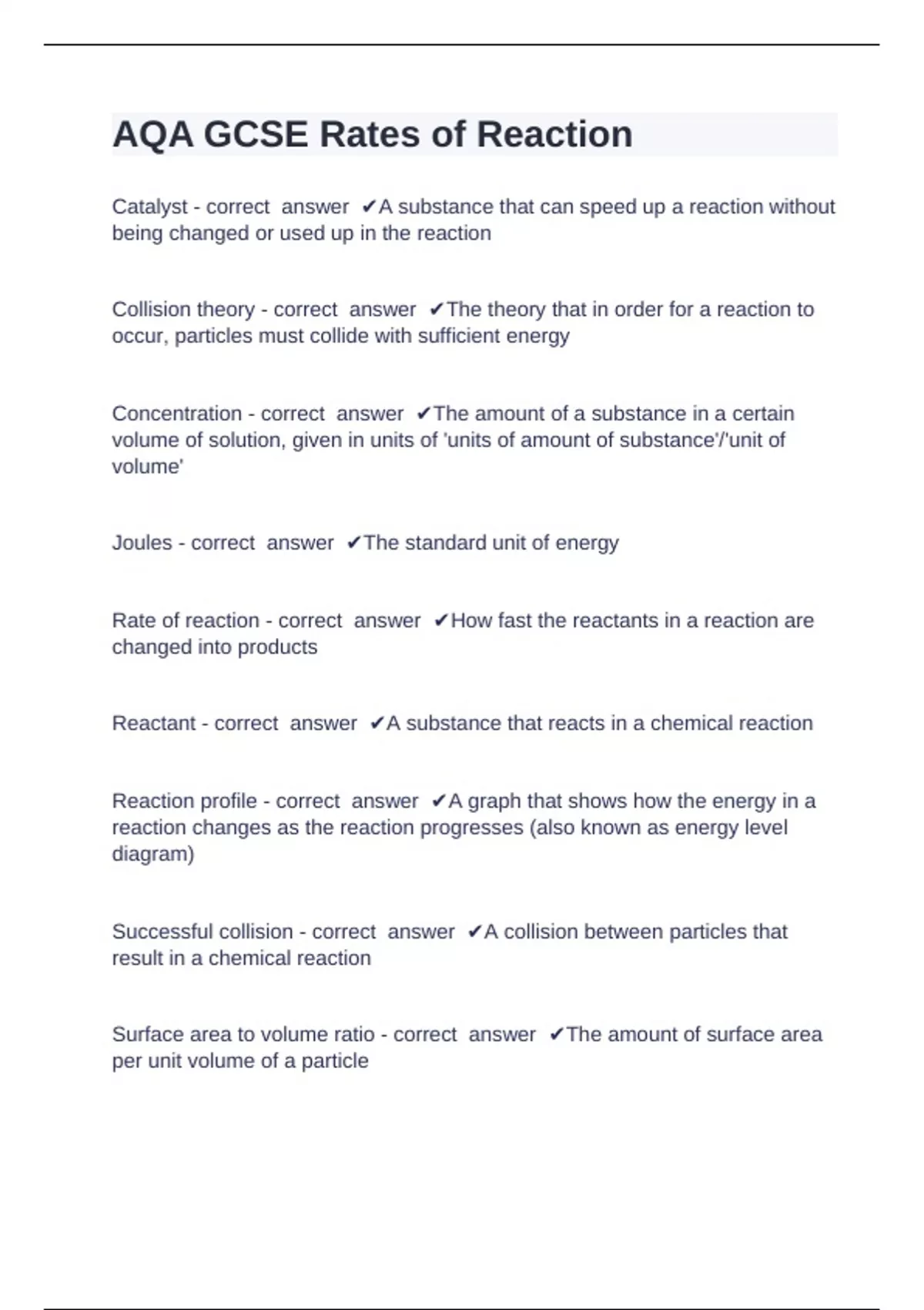 AQA GCSE Rates of Reaction Question and answers verified to pass 2024 Catalyst - correct answer A substance that can speed up a reaction without being changed or used up in the reaction Collision theory - correct answer The theory that in order for a reaction to occur, particles must collide with sufficient energy Concentration - correct answer The amount of a substance in a certain volume of solution, given in units of 'units of amount of substance'/'unit of volume' Joules - correct answer The standard unit of energy Rate of reaction - correct answer How fast the reactants in a reaction are changed into products Reactant - correct answer A substance that reacts in a chemical reaction Reaction profile - correct answer A graph that shows how the energy in a reaction changes as the reaction progresses (also known as energy level diagram) Successful collision - correct answer A collision between particles that result in a chemical reaction Surface area to volume ratio - correct answer The amount of surface area per unit volume of a p