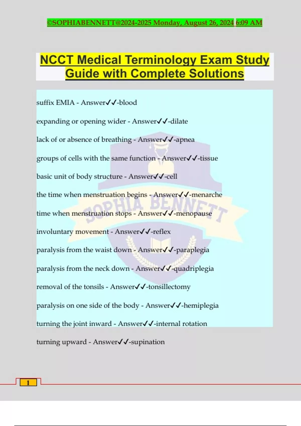 NCCT Medical Terminology Exam Study Guide with Complete Solutions suffix EMIA - Answer️️ -blood expanding or opening wider - Answer️️ -dilate lack of or absence of breathing - Answer️️ -apnea groups of cells with the same function - Answer️️ -tissue basic unit of body structure - Answer️️ -cell the time when menstruation begins - Answer️️ -menarche time when menstruation stops - Answer️️ -menopause involuntary movement - Answer️️ -reflex paralysis from the waist down - Answer️️ -paraplegia paralysis from the neck down - Answer️️ -quadriplegia removal of the tonsils - Answer️️ -tonsillectomy paralysis on one side of the body - Answer️️ -hemiplegia turning the joint inward - Answer️️ -internal rotation turning upward - Answer️️ -supination ©SOPHIABENNETT@ Monday, August 26, 2024 6:09 AM 2 decrease in size or a wasting - Answer️️ -atrophy straightening of a body part - Answer️️ -extension moving a body part away from the body - Answer️️ -abduction bending a body part - Answer️️ -flexion turning downward - Answer️️ -pronation bending backward - Answer️️ -dorsiflexion abnormal shortening of a muscle - Answer️️ -contracture moving a body part toward the body - Answer️️ -adduction loss of appetite - Answer️️ -anorexia tube feeding - Answer️️ -gavage swelling of body with water - Answer️️ -edema painful or difficult urination - Answer️️ -dysuria sugar in the urine - Answer️️ -glucosuria decubitis ulcer, a pressure sore - Answer️️ -bedsore preparation that masks and controls body odor - Answer️️ -deodorant itis - Answer️️ -inflammation hema, hemo - Answer️️ -blood ©SOPHIABENNETT@ Monday, August 26, 2024 6:09 AM 3 hyster - Answer️️ -uterus mast - Answer️️ -breast gastro - Answer️️ -stomach myo - Answer️️ -muscle otomy - Answer️️ -incision, surgical cutting oma - Answer️️ -tumor phlebo - Answer️️ -vein pneumo - Answer️️ -air, lungs adeno - Answer️️ -gland algia, algesia - Answer️️ -pain cardio - Answer️️ -heart cranio - Answer️️ -skull ectomy - Answer️️ -surgical removal endo - Answer️️ -within, inner, on the insid