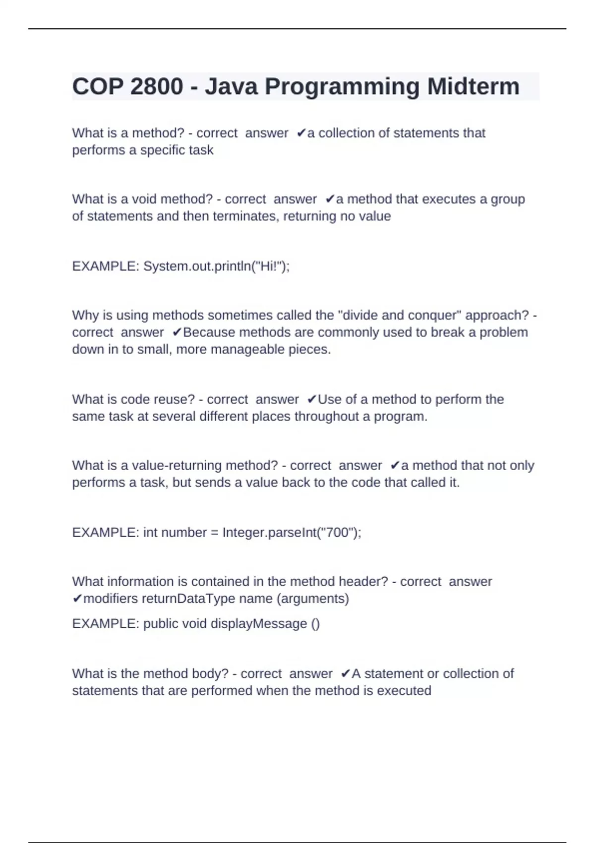 What is code reuse? - correct answer ✔Use of a method to perform the