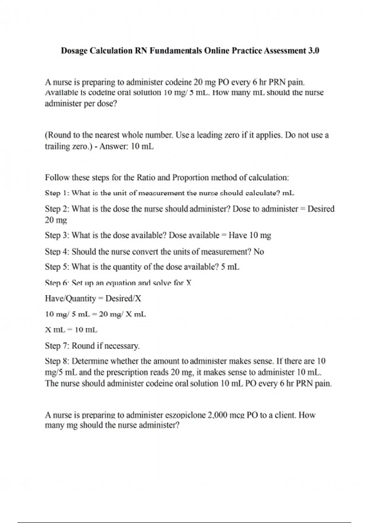 A nurse is preparing to administer codeine 20 mg PO every 6 hr PRN pain. Available is codeine oral solution 10 mg/ 5 mL. How many mL should the nurse administer per dose? (Round to the nearest whole number. Use a leading zero if it applies. Do not use a trailing zero.) - Answer: 10 mL Follow these steps for the Ratio and Proportion method of calculation: Step 1: What is the unit of measurement the nurse should calculate? mL Step 2: What is the dose the nurse should administer? Dose to administer = Desired 20 mg Step 3: What is the dose available? Dose available = Have 10 mg Step 4: Should the nurse convert the units of measurement? No Step 5: What is the quantity of the dose available? 5 mL Step 6: Set up an equation and solve for X. Have/Quantity = Desired/X 10 mg/ 5 mL = 20 mg/ X mL X mL = 10 mL Step 7: Round if necessary. Step 8: Determine whether the amount to administer makes sense. If there are 10 mg/5 mL and the prescription reads 20 mg, it makes sense to administer 10 mL. The nurse should administer codeine oral solution 10 mL PO every 6 hr PRN pain. A nurse is preparing to administer eszopiclone 2,000 mcg PO to a client. How many mg should the nurse administer? (Round to the nearest whole number. Use a leading zero if it applies. Do not use a trailing zero.) - Answer: 2 mg Follow these steps for the Ratio and Proportion method of calculation: Step 1: What is the unit of measurement the nurse should calculate? mg Step 2: What is the dose the nurse should administer? Dose to administer = Desired 2,000 mcg Step 3: What is the dose available? Dose available = Have 1 mg Step 4: Should the nurse convert the units of measurement? Yes (mcg does not equal mg) 1,000 mcg/1 mg = 2,000 mcg/X mg X mg = 2 mg Step 5: Round if necessary. Step 6: Determine whether the amount to administer makes sense. If the prescription reads 2,000 mcg and 1,000 mcg equals 1 mg, it makes sense to administer 2 mg. The nurse should administer eszopiclone 2 mg PO.