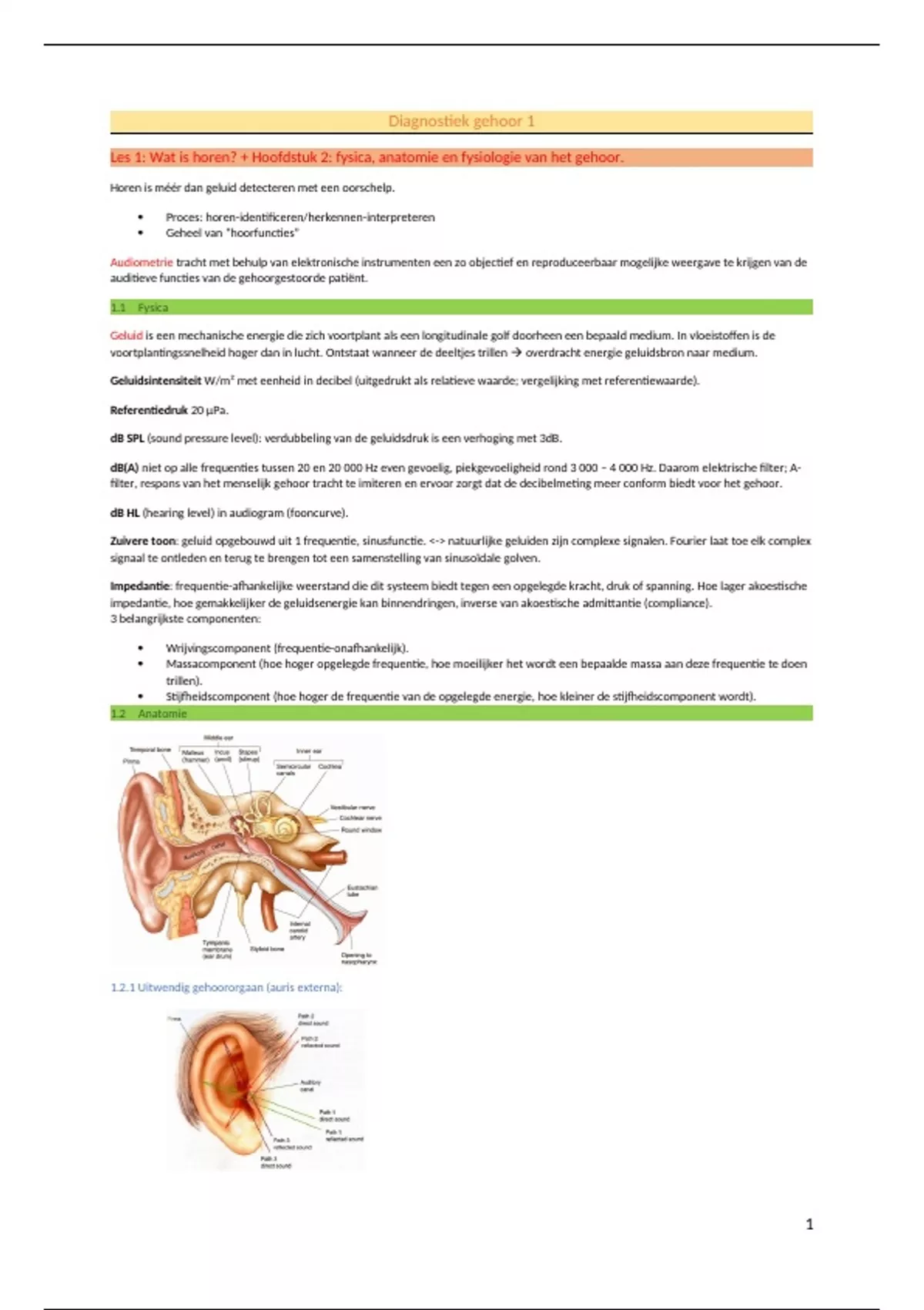 Les 1: Wat is horen? + Hoofdstuk 2: fysica, anatomie en fysiologie van het gehoor.