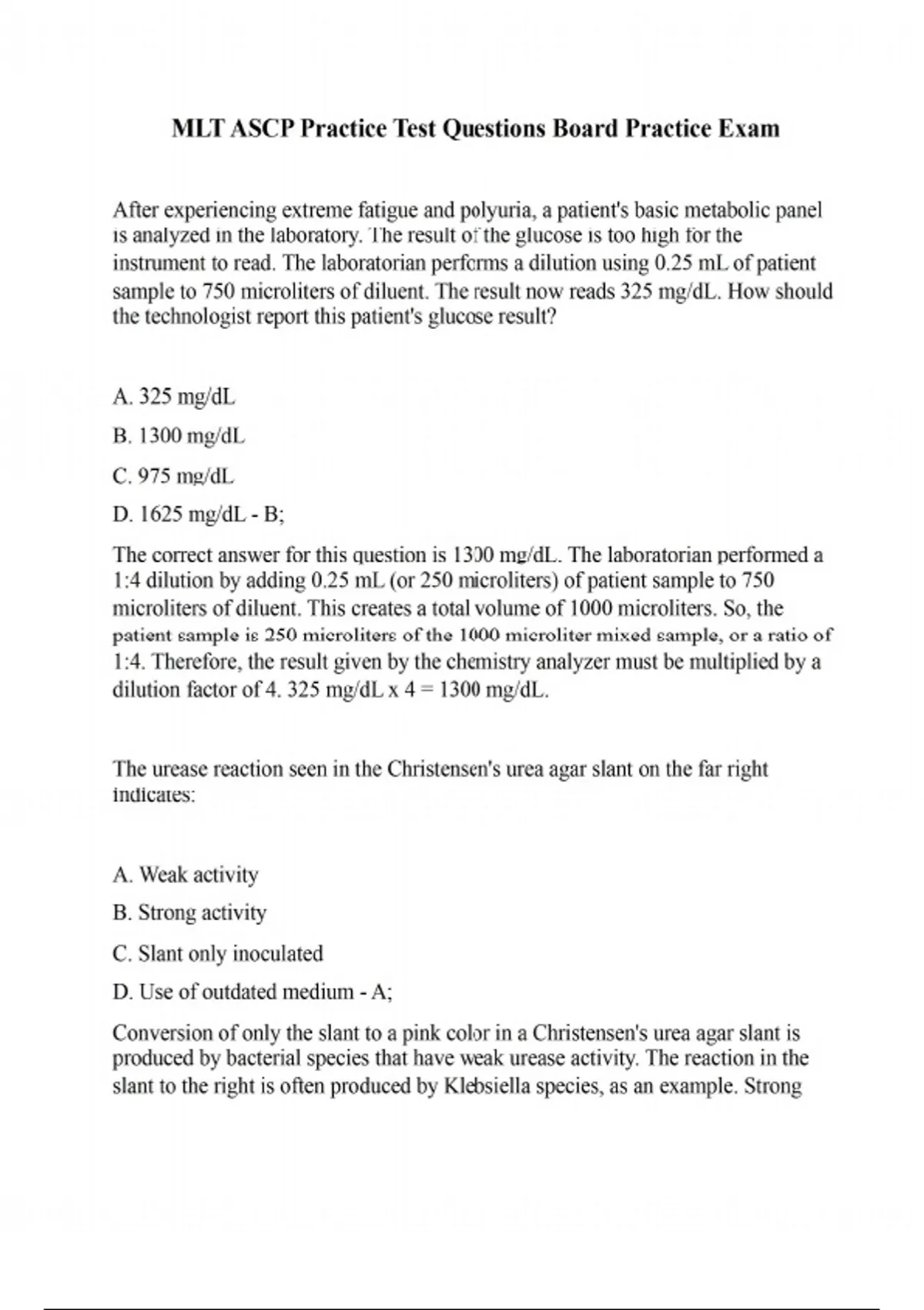 After experiencing extreme fatigue and polyuria, a patient's basic metabolic panel is analyzed in the laboratory. The result of the glucose is too high for the instrument to read. The laboratorian performs a dilution using 0.25 mL of patient sample to 750 microliters of diluent. The result now reads 325 mg/dL. How should the technologist report this patient's glucose result? A. 325 mg/dL B. 1300 mg/dL C. 975 mg/dL D. 1625 mg/dL - B; The correct answer for this question is 1300 mg/dL. The laboratorian performed a 1:4 dilution by adding 0.25 mL (or 250 microliters) of patient sample to 750 microliters of diluent. This creates a total volume of 1000 microliters. So, the patient sample is 250 microliters of the 1000 microliter mixed sample, or a ratio of 1:4. Therefore, the result given by the chemistry analyzer must be multiplied by a dilution factor of 4. 325 mg/dL x 4 = 1300 mg/dL. The urease reaction seen in the Christensen's urea agar slant on the far right indicates: A. Weak activity B. Strong activity C. Slant only inoculated D. Use of outdated medium - A; Conversion of only the slant to a pink color in a Christensen's urea agar slant is produced by bacterial species that have weak urease activity. The reaction in the slant to the right is often produced by Klebsiella species, as an example. Strong urease activity is indicated by conversion of the slant and the butt of the tube to a pink color, as seen in the tube to the left. The slant only reaction in the right tube may be seen early on if only the slant had been inoculated; however, with a strong urease producer, both the slant and the butt would turn. Therefore, the reaction is dependent on the strength of urease activity. If the media had outdated for a prolonged period, either there would be no reaction or the appearance of only a faint pink tinge, either in the slant, the butt or both, again depending on the strength of urease production by the unknown organism. What is the first step of the PCR reaction? A. Hybridization B. Extension C. Annealing D. Denaturation - D; The steps in the PCR process are: 1. Denaturation (Turning double stranded DNA into single strands.) 2. Annealing/Hybrization (Attachment of primers to the single DNA strands.) 3. Extension (Creating the complementary strand to produce new double stranded DNA.) The concentration of sodium chloride in an isotonic solution is : A. 8.5 % B. 0.85 % C. 0.08 % D. 1 molar - B; Isotonic or normal saline is a 0.85 % solution of sodium chloride in water. Which of the following laboratory results would be seen in a patient with acute Disseminated Intravascular Coagulation (DIC)? A. prolonged PT, elevated platelet count, decreased FDP B. normal PT, decreased fibrinogen, decreased platelet count, decreased FDP C. prolonged PT, decreased fibrinogen, decreased platelet count, increased FDP D. normal PT, decreased platelet count, decreased FDP - C; In DIC, or disseminated intravascular coagulation, the prothrombin time is increased due to the consumption of the coagulation factors due to the tiny clots forming throughout the vasculature. This is also the reason that the fibrinogen levels and platelet levels are decreased. Finally FDP, or fibrin degredation products, are increased due to the formation and subsequent dissolving of many tiny clots in the vasculature. The FDPs are the pieces of fibrin that are left after the fibrinolytic processes take place. A dilution commonly used for a routine sperm count is: A. 1:2 B. 1:20 C. 1:200 D. 1:400 - B; A dilution commonly used for a routine sperm count is a 1:20.