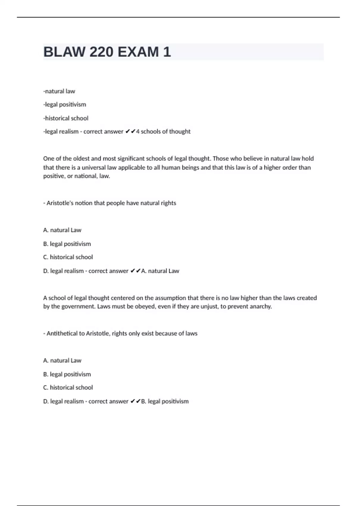 D. legal realism - correct answer ✔✔B. legal positivism