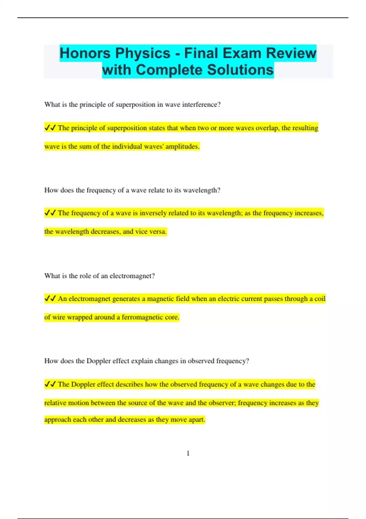 Honors Physics - Final Exam Review with Complete Solutions What is the principle of superposition in wave interference? The principle of superposition states that when two or more waves overlap, the resulting wave is the sum of the individual waves' amplitudes. How does the frequency of a wave relate to its wavelength? The frequency of a wave is inversely related to its wavelength; as the frequency increases, the wavelength decreases, and vice versa. What is the role of an electromagnet? An electromagnet generates a magnetic field when an electric current passes through a coil of wire wrapped around a ferromagnetic core. How does the Doppler effect explain changes in observed frequency? The Doppler effect describes how the observed frequency of a wave changes due to the relative motion between the source of the wave and the observer; frequency increases as they approach each other and decreases as they move apart. 2 What determines the buoyant force on an object submerged in a fluid? The buoyant force is determined by the weight of the fluid displaced by the object, according to Archimedes' principle. What is the relationship between electric current, voltage, and resistance in Ohm’s Law? Ohm’s Law states that the electric current through a conductor is directly proportional to the voltage across it and inversely proportional to the resistance. How does the principle of conservation of momentum apply in collisions? The principle of conservation of momentum states that in a closed system, the total momentum before and after a collision remains constant, provided no external forces act on it. What is the difference between a scalar and a vector quantity in physics? A scalar quantity has only magnitude, such