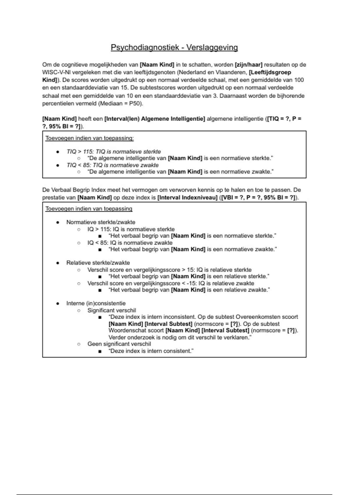 Zelfgemaakt stappenplan dat dient als handleiding voor het schrijven van een psychodiagnostisch verslag, te gebruiken bij het praktijkexamen voor verslaggeving. Wat er op het formulier staat, kan letterlijk overgeschreven worden. Alles wat vetgedrukt staat, dient ingevuld te worden door informatie die uniek zal zijn voor de casus die men krijgt. Met dit formulier had ik uiteindelijk een 18/20 voor het praktijkgedeelte van Psychodiagnostiek.