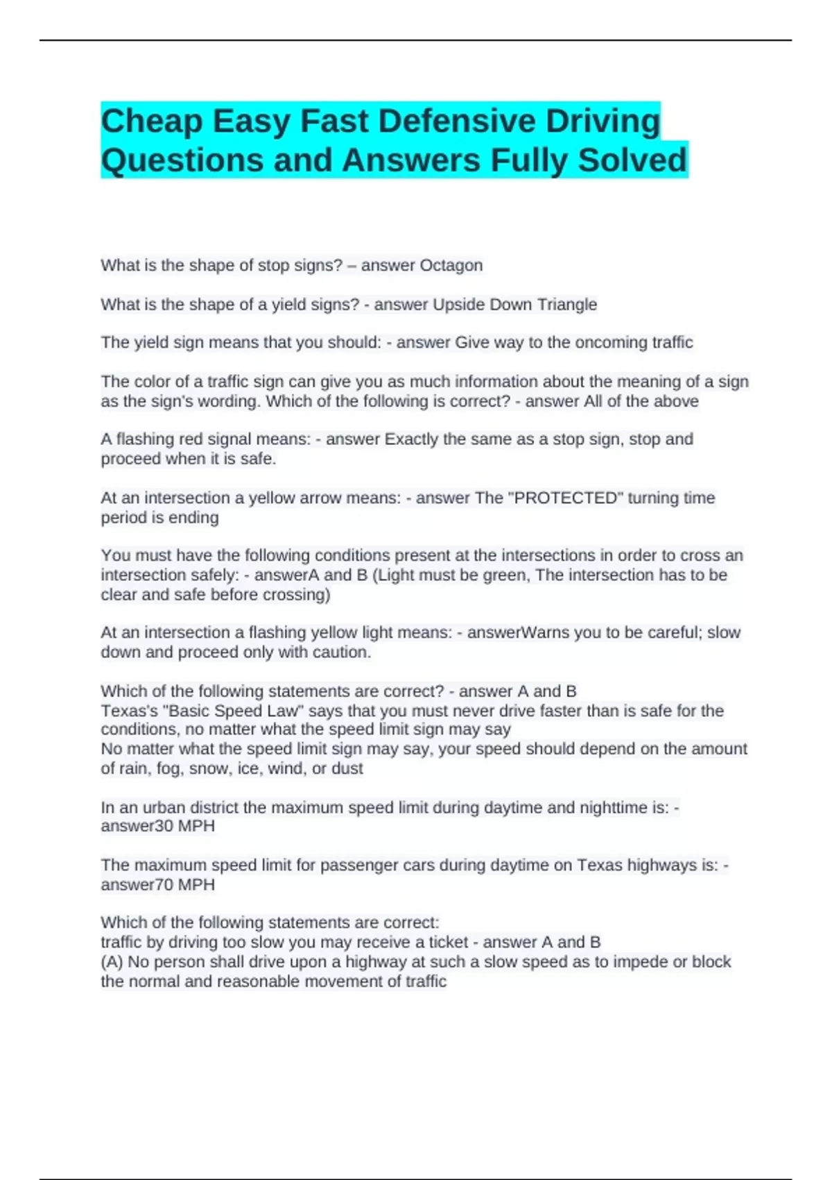 Cheap Easy Fast Defensive Driving Questions and Answers Fully Solved