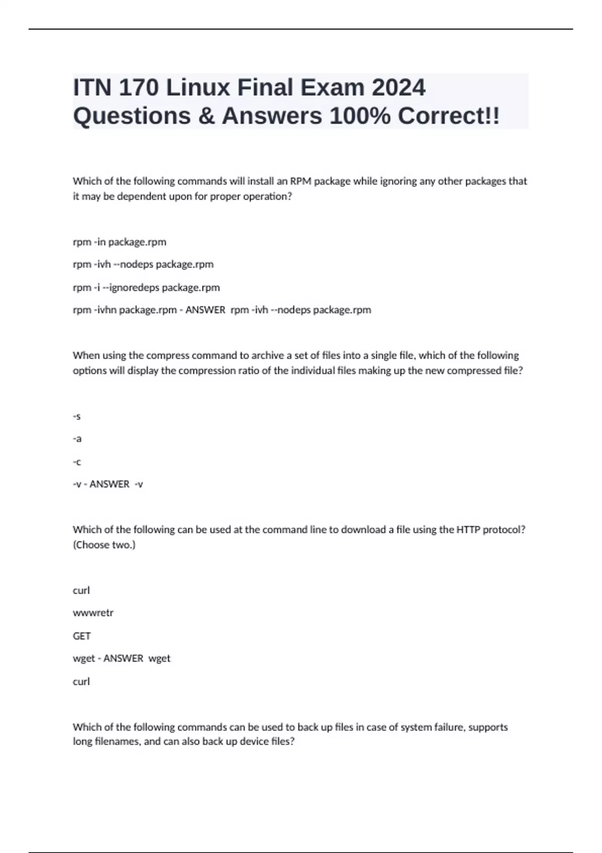 Which of the following commands will install an RPM package while ignoring any other packages that it may be dependent upon for proper operation? rpm -in rpm -ivh --nodeps rpm -i --ignoredeps rpm -ivhn - ANSWER rpm -ivh --nodeps When using the compress command to archive a set of files into a single file, which of the following options will display the compression ratio of the individual files making up the new compressed file? -s -a -c -v - ANSWER -v Which of the following can be used at the command line to download a file using the HTTP protocol? (Choose two.) curl wwwretr GET wget - ANSWER wget curl Which of the following commands can be used to back up files in case of system failure, supports long filenames, and can also back up device files? cpio diskdup bkup sysbackup - ANSWER cpio