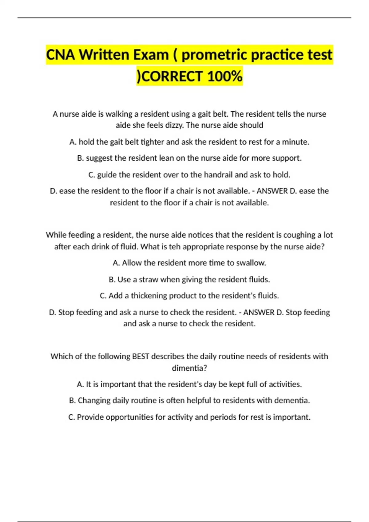 CNA Written Exam ( prometric practice test )CORRECT 100%