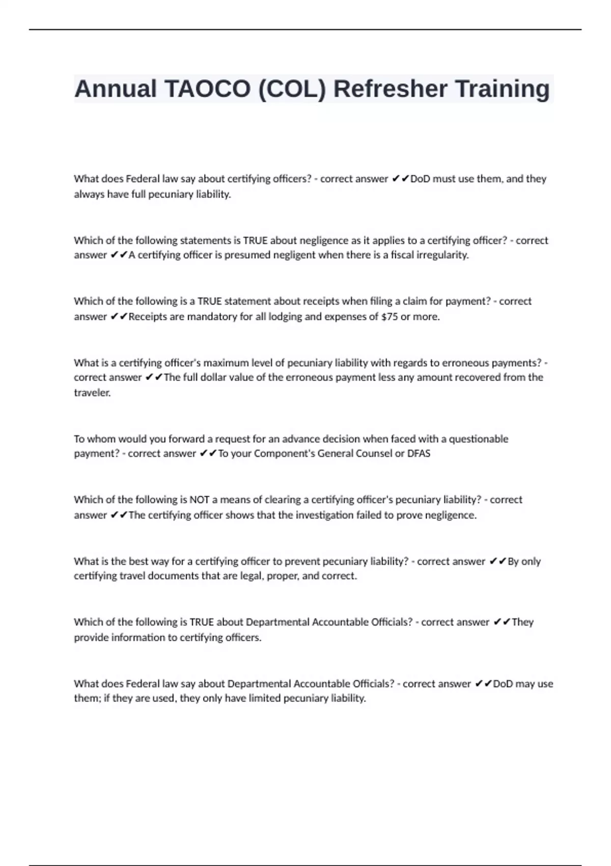 Annual TAOCO (COL) Refresher Training with complete solutions