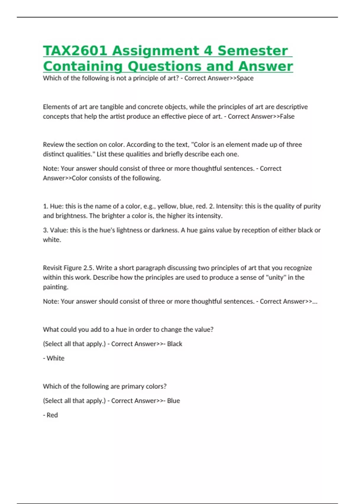 TAX2601 Assignment 4 Semester Containing Questions and Answer Which of the following is not a principle of art? - Correct Answer>>Space Elements of art are tangible and concrete objects, while the principles of art are descriptive concepts that help the artist produce an effective piece of art. - Correct Answer>>False Review the section on color. According to the text, "Color is an element made up of three distinct qualities." List these qualities and briefly describe each one. Note: Your answer should consist of three or more thoughtful sentences. - Correct Answer>>Color consists of the following. 1. Hue: this is the name of a color, e.g., yellow, blue, red. 2. Intensity: this is the quality of purity and brightness. The brighter a color is, the higher its intensity. 3. Value: this is the hue's lightness or darkness. A hue gains value by reception of either black or white. Revisit Figure 2.5. Write a short paragraph discussing two principles of art that you recognize within this work. Describe how the principles are used to produce a sense of "unity" in the painting. Note: Your answer should consist of three or more thoughtful sentences. - Correct Answer>>... What could you add to a hue in order to change the value? (Select all that apply.) - Correct Answer>>- Black - White Which of the following are primary colors? (Select all that apply.) - Correct Answer>>- Blue - Red - Yellow Analogous colors __________. - Correct Answer>>Are related In order to produce the color red-orange, you must __________. - Correct Answer>>Mix two warm colors together Primary colors can be produced by mixing, and they are used to mix all the other colors on the value scale. - Correct Answer>>False