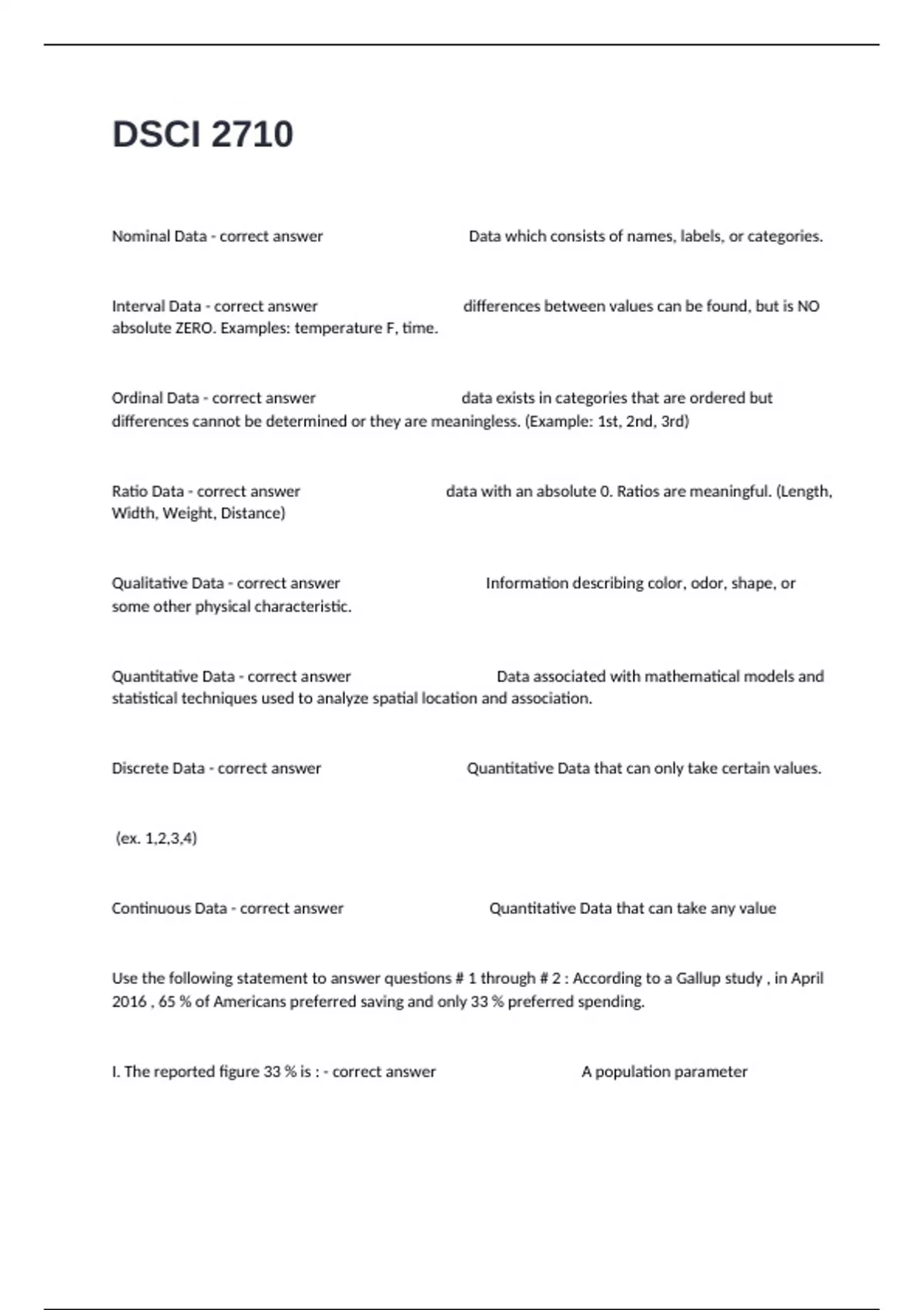 Continuous Data - correct answer Quantitative Data that can take any value