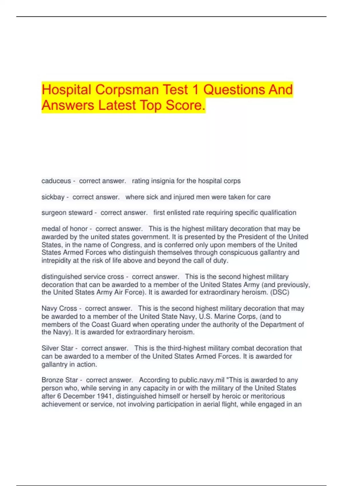 medal of honor - correct answer. This is the highest military decoration that may be