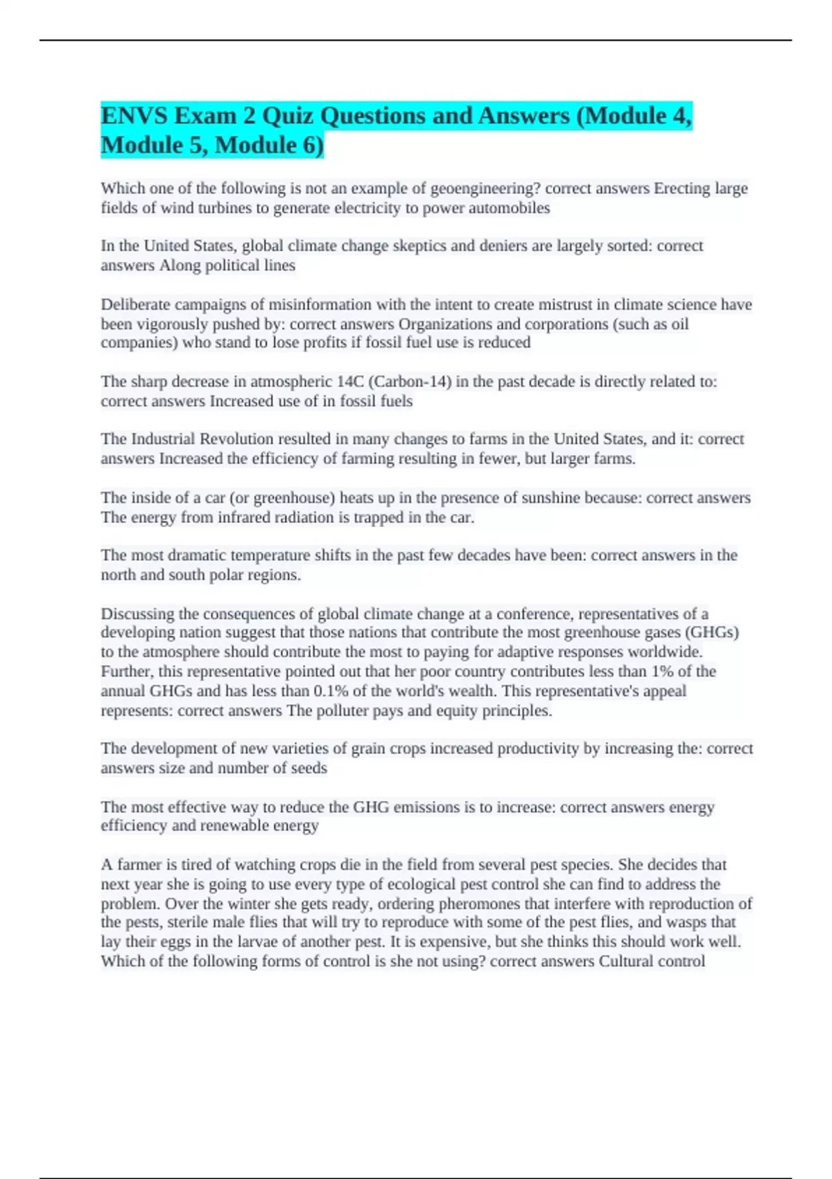 Which one of the following is not an example of geoengineering? correct answers Erecting large fields of wind turbines to generate electricity to power automobiles In the United States, global climate change skeptics and deniers are largely sorted: correct answers Along political lines Deliberate campaigns of misinformation with the intent to create mistrust in climate science have been vigorously pushed by: correct answers Organizations and corporations (such as oil companies) who stand to lose profits if fossil fuel use is reduced The sharp decrease in atmospheric 14C (Carbon-14) in the past decade is directly related to: correct answers Increased use of in fossil fuels The Industrial Revolution resulted in many changes to farms in the United States, and it: correct answers Increased the efficiency of farming resulting in fewer, but larger farms. The inside of a car (or greenhouse) heats up in the presence of sunshine because: correct answers The energy from infrared radiation is trapped in the car. The most dramatic temperature shifts in the past few decades have been: correct answers in the north and south polar regions. Discussing the consequences of global climate change at a conference, representatives of a developing nation suggest that those nations that contribute the most greenhouse gases (GHGs) to the atmosphere should contribute the most to paying for adaptive responses worldwide. Further, this representative pointed out that her poor country contributes less than 1% of the annual GHGs and has less than 0.1% of the world's wealth. This representative's appeal represents: correct answers The polluter pays and equity principles. The development of new varieties of grain crops increased productivity by increasing the: correct answers size and number of seeds The most effective way to reduce the GHG emissions is to increase: correct answers energy efficiency and renewable energy A farmer is tired of watching crops die in the field from several pest species. She decides that next year she is going to use every type of ecological pest control she can find to address the problem. Over the winter she gets ready, ordering pheromones that interfere with reproduction of the pests, sterile male flies that will try to reproduce with some of the pest flies, and wasps that lay their eggs in the larvae of another pest. It is expensive, but she thinks this should work well. Which of the following forms of control is she not using? correct answers Cultural control