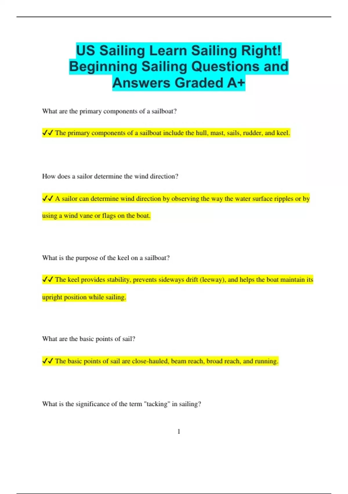 US Sailing Learn Sailing Right! Beginning Sailing Questions and Answers Graded A+