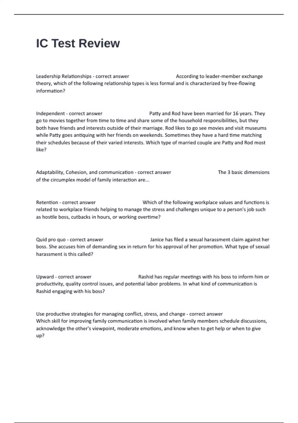 Leadership Relationships - correct answer According to leader-member exchange theory, which of the following relationship types is less formal and is characterized by free-flowing information? Independent - correct answer Patty and Rod have been married for 16 years. They go to movies together from time to time and share some of the household responsibilities, but they both have friends and interests outside of their marriage. Rod likes to go see movies and visit museums while Patty goes antiquing with her friends on weekends. Sometimes they have a hard time matching their schedules because of their varied interests. Which type of married couple are Patty and Rod most like? Adaptability, Cohesion, and communication - correct answer The 3 basic dimensions of the circumplex model of family interaction are... Retention - correct answer Which of the following workplace values and functions is related to workplace friends helping to manage the stress and challenges unique to a person's job such as hostile boss, cutbacks in hours, or working overtime? Quid pro quo - correct answer Janice has filed a sexual harassment claim against her boss. She accuses him of demanding sex in return for his approval of her promotion. What type of sexual harassment is this called? Upward - correct answer Rashid has regular meetings with his boss to inform him or productivity, quality control issues, and potential labor problems. In what kind of communication is Rashid engaging with his boss? Use productive strategies for managing conflict, stress, and change - correct answer Which skill for improving family communication is involved when family members schedule discussions, acknowledge the other's viewpoint, moderate emotions, and know when to get help or when to give up? Conformity - correct answer According to Fitzpatrick, Ritchie, and Koerner, the degree to which a family pushes all members to agree to the same set of beliefs, values, and attitudes represents its _____ orientation. Natural family - correct answer Heidi and Gunther live with their biological parents. What type of family would this be called? Outcomes of receiving comforting messages - correct answer What are these: They put the distressed person in a more positive mood. They empower the person to better manage the issues at hand. They help reduce brooding about the problems. Listening actively and responding effectively - correct answer Barbara and George have been married for several years. George has learned that when Barbara wants to talk, he needs to eliminate distractions. So, when she comes into the bedroom after having attended the school board meeting and starts talking, he turns off the TV, even though it's a show he has been waiting to see, and devotes all his attention to her. Which strategy for escalating and maintaining a relationship is George employing? Approachability Cues - correct answer Janelle likes Allen. When he approaches her she turns to him, waves, and gives an animated smile. She is manifesting...? Unrequited romantic interest - correct answer Toni has been secretly in love with Janessa for about 2 years. They are good friends, but Toni wants to move things to a more romantic level. When he talks to Janessa about his feelings, she very kindly but firmly tells him that she is only interested in a friendship with him. According to the text, Toni's situation could be described as Ludis - correct answer Annie and Luke met during their freshman year of college. They dated now and then, but not exclusively. Annie found that she could count on Luke to ask her out to key social events such as the college's spring banquet. Both Annie and Luke enjoy each other's company, but neither has really given much thought to marrying the other. Their relationship is characteristic of what type of love? Intimacy, passion, and commitment - correct answer What are the dimensions utilized in the triangular theory of love? Men - correct answer What gender reports having more best friends? Men or Women? Young adult - correct answer Which friendships are most important for honing our skills for successful romantic relationships? Grave dressing - correct answer In this stage of the ending of a relationship, one or both partners use a public story that they can share with others about what happened. Direct strategy of negative identity management - correct answer When Felix tells Alex that he doesn't want to be friends anymore because, "i just don't like the way you behave around other people," the strategy for terminating their friendship, according to Baxter, is a...? physical separation - correct answer When one researcher asked individuals to identify why their friendships with a friend of the same sex ended, first on the list of reasons was...? Incrementalism - correct answer Trouble has been brewing in the relationship between Shawn and Trevor for quite some time. One problem seems to go away and another one emerges. At some point the couple decides they can't take it anymore and decide to break up. This kind of breakup is best identified as an example of? Intimate terrorism - correct answer Jim uses verbal threats against Kathy as a way of maintaining dominance in their relationship. Jim's actions display which type of partner violence? indicate increasing problems in a marriage - correct answer Criticism or attacks on someone's personality, display of contempt, and stonewalling are 3 of the 4 categories of communication behavior that....? acquiescent - correct answer Carla cried when Elmer said he thought Carla was a "spoiled brat." Carla's crying about Elmer's hurtful comment is an______response. protect his self image - correct answer When Carlos lies to Jacob about how much money he makes at his new job because he is embarrassed at how little he makes, his reason for lying is best described as to...? reproach - correct answer Maria's accusation that John cheated on her is called a...? Best interest - correct answer In essence, we forg